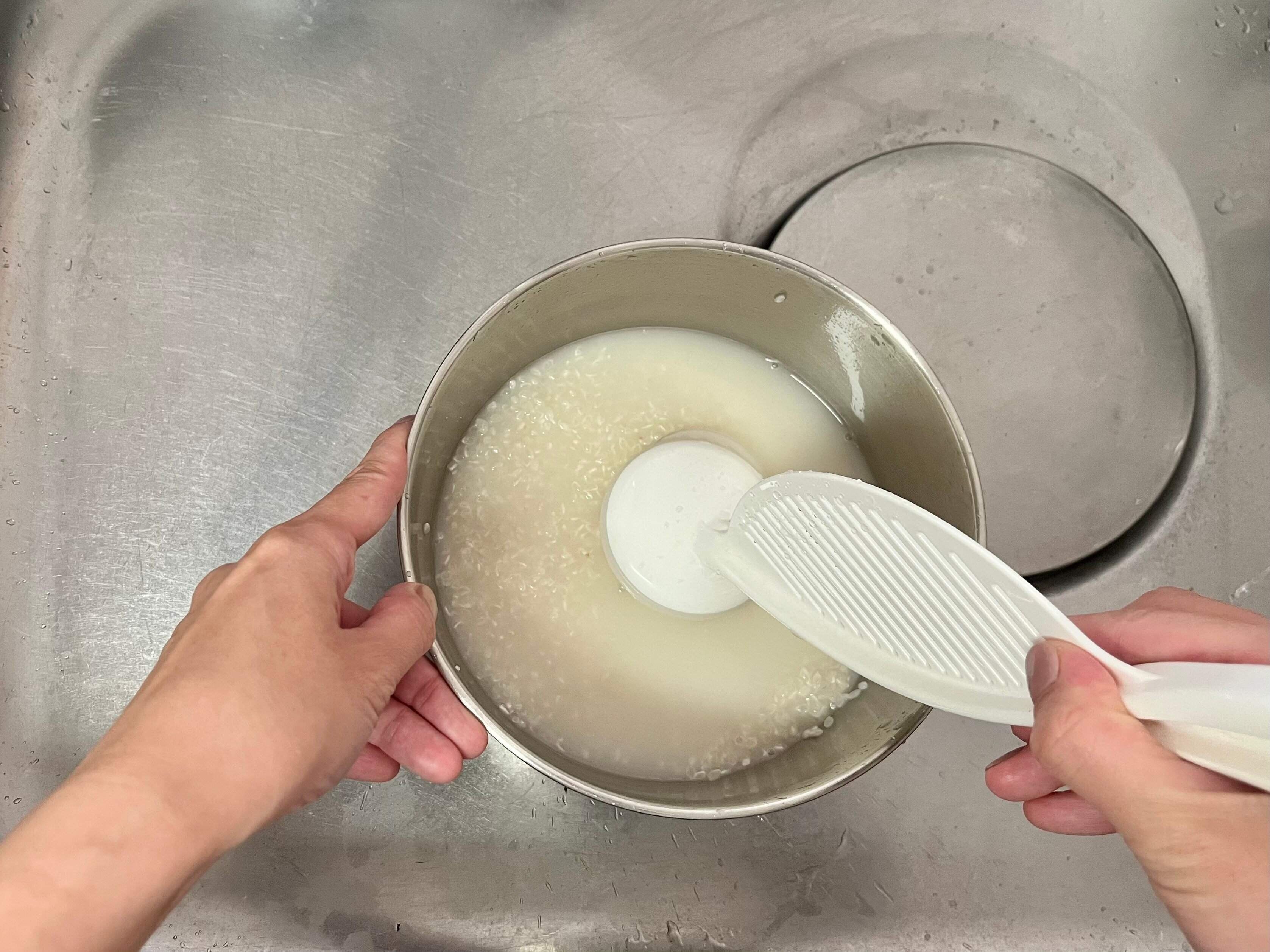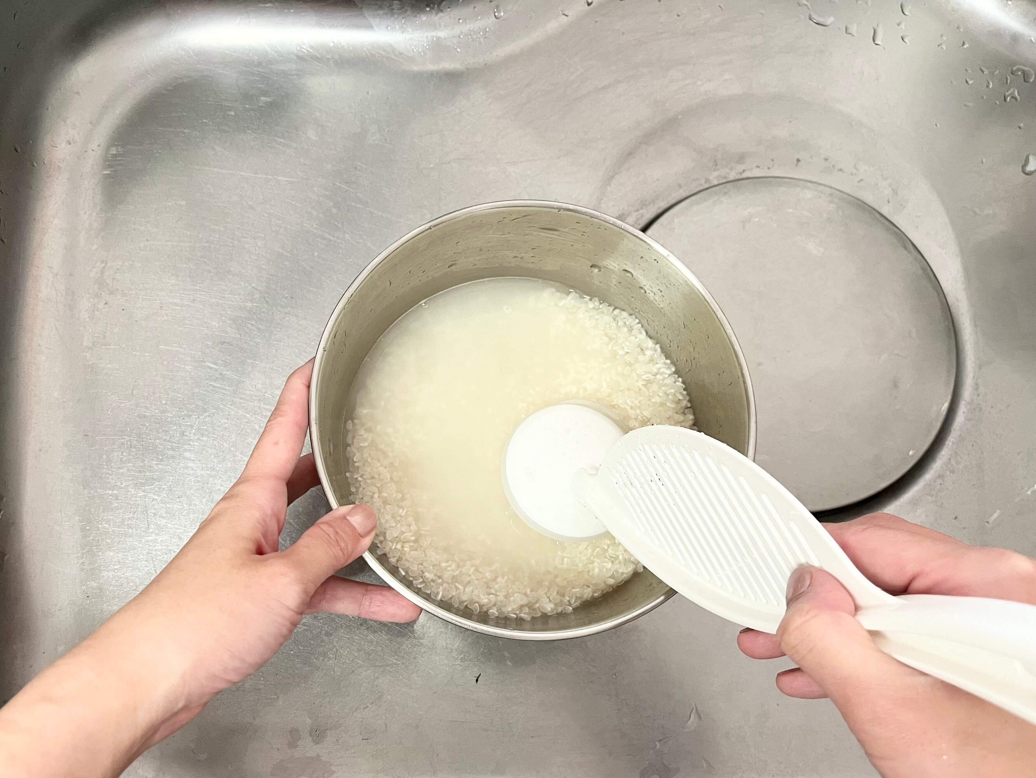 では、早速使ってみたいと思います。まず、お米が浸るぐらい水を入れ、丸い方のパーツでサッと数回かき回してすすぎます。
