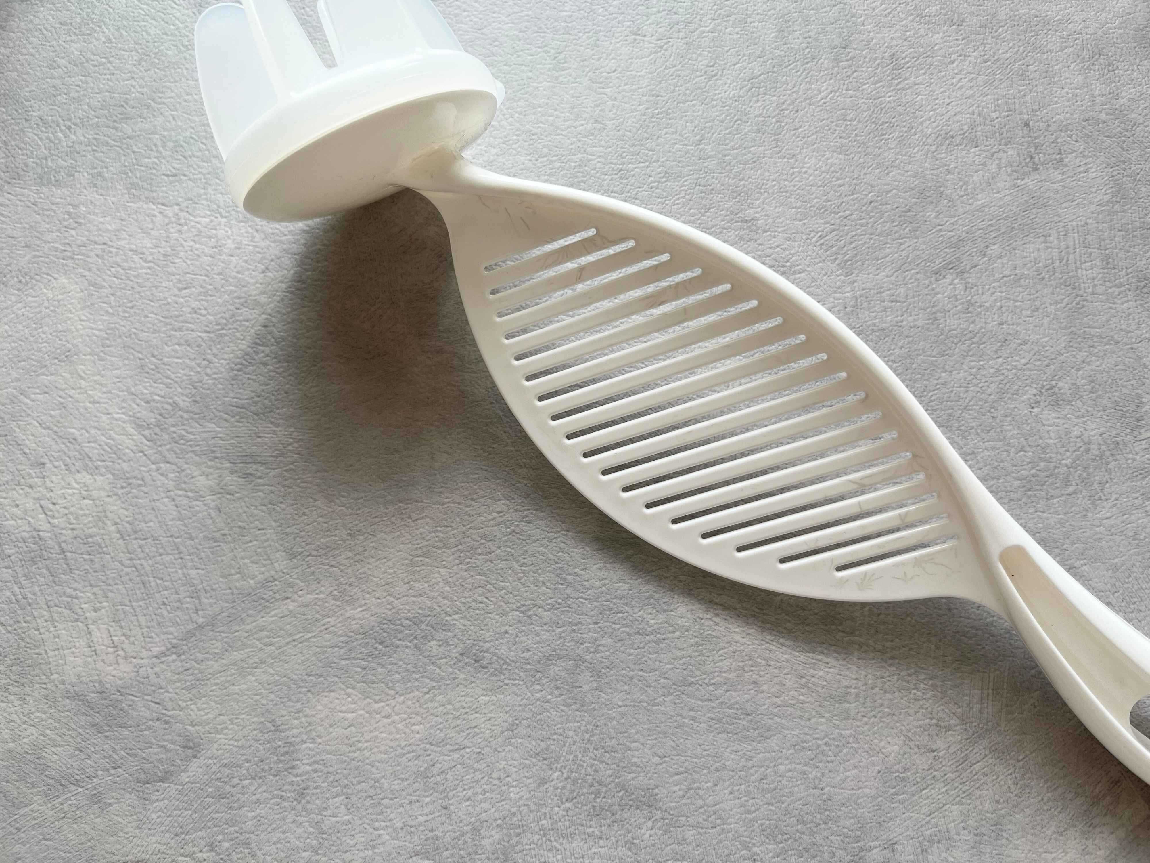 商品のサイズは、約6.5cm×6.4cm×29.8cm。だいたい一般的なしゃもじよりも少し長いぐらいの大きさで、独特な形をしています。