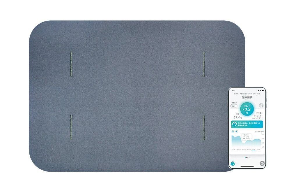 乗るだけで体重や体脂肪率などの体組成の測定ができるソフト珪藻土のバスマット。Wi-Fi経由でスマホの専用アプリにデータを転送。自動で記録される。¥19,800(送料込み) /issin