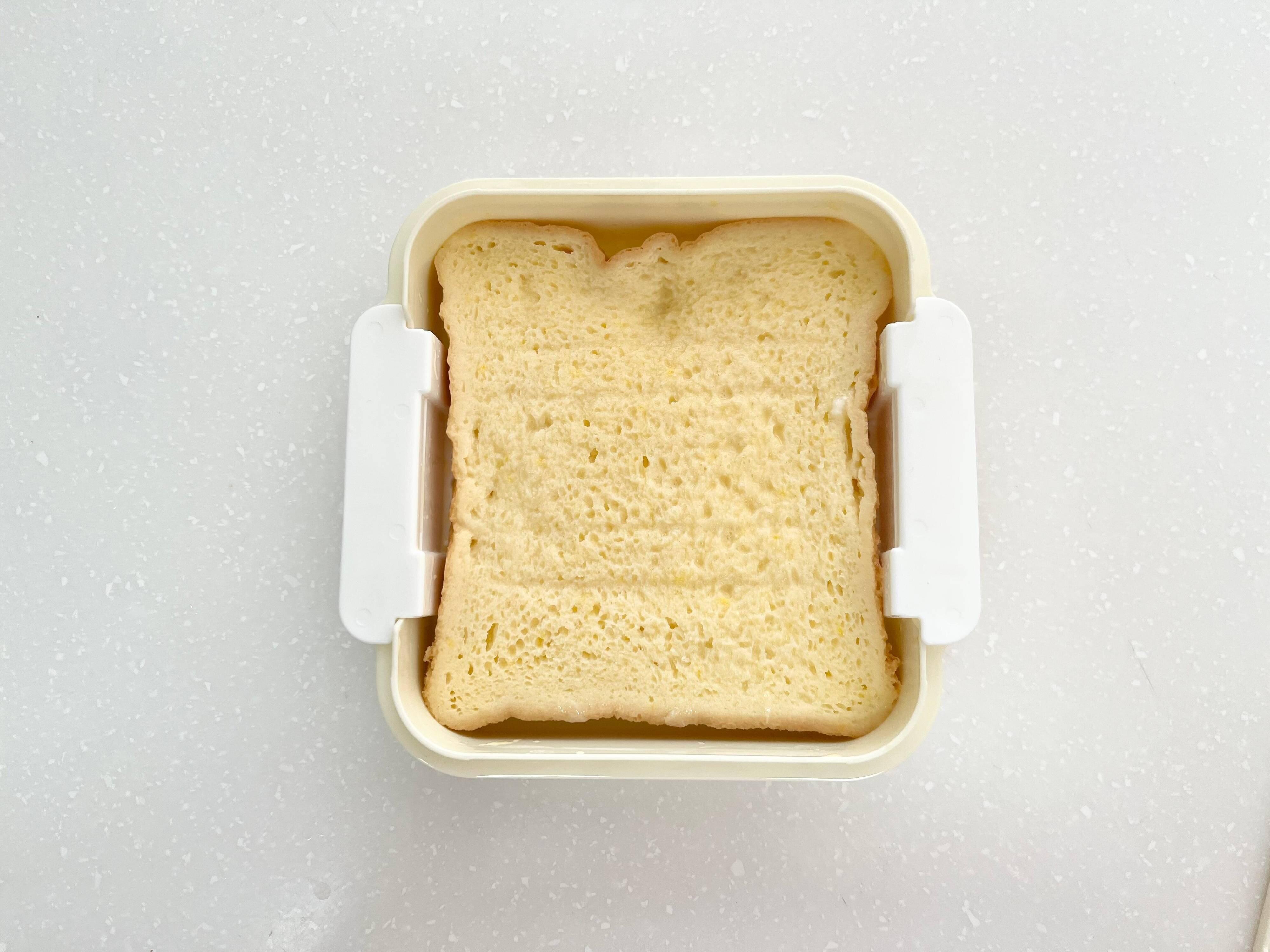 次は容器にバスケット、食パンの順にセットします。食パンは4枚切りから6枚切りのものが使用可能。そして蓋をしてから、冷蔵庫で20分ほど寝かせます。