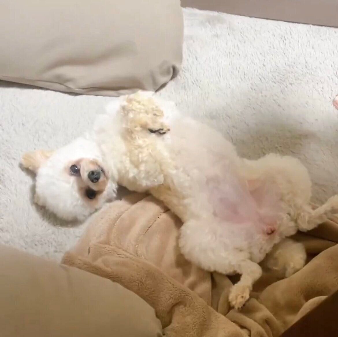ひつじにこさん(@ni918co)が投稿したのは、愛犬にこちゃんの動画。甘えん坊なにこちゃんは、寝室に行くときも飼い主さんに抱っこして欲しいそう。寝る時間になると、へそ天になり抱っこして欲しいとアピールする姿に「可愛い」の声が集まりました。