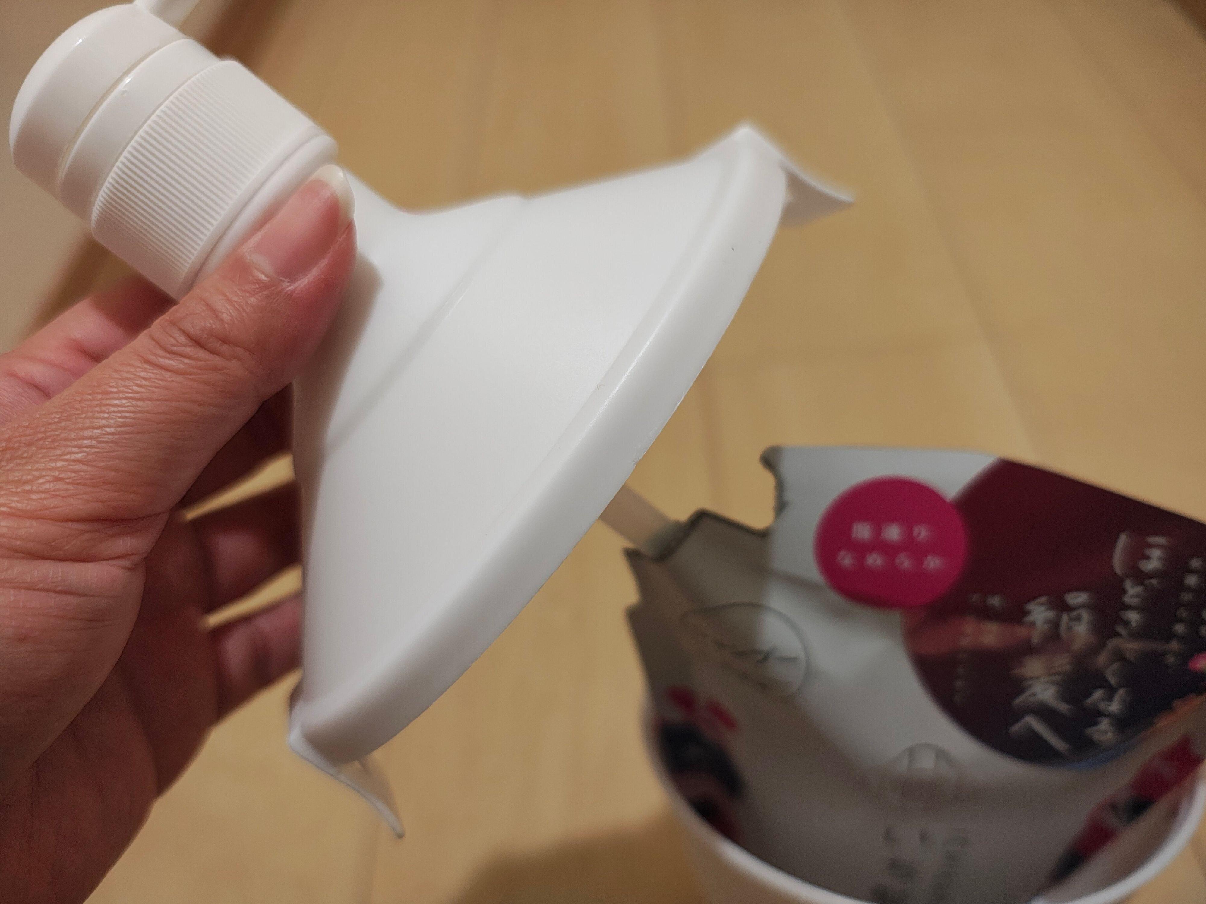 続いて、詰め替え用のパックの口を切ります。パックの口にフタのストロー部分を差し込み、フタを本体に固定します。