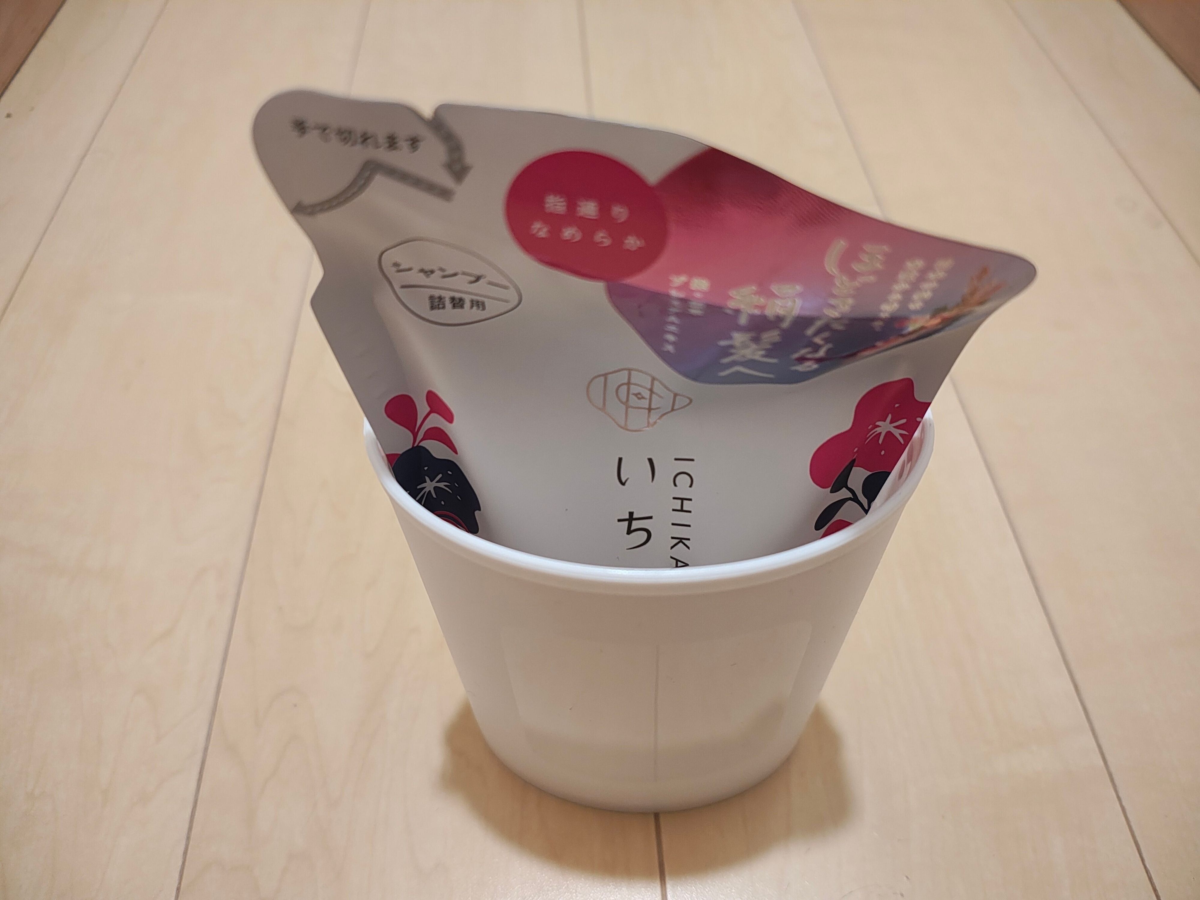 詰め替えのパックが丸ごと中に入るようになっているので、一般的なシャンプーのボトルと比べると少し大きめです。