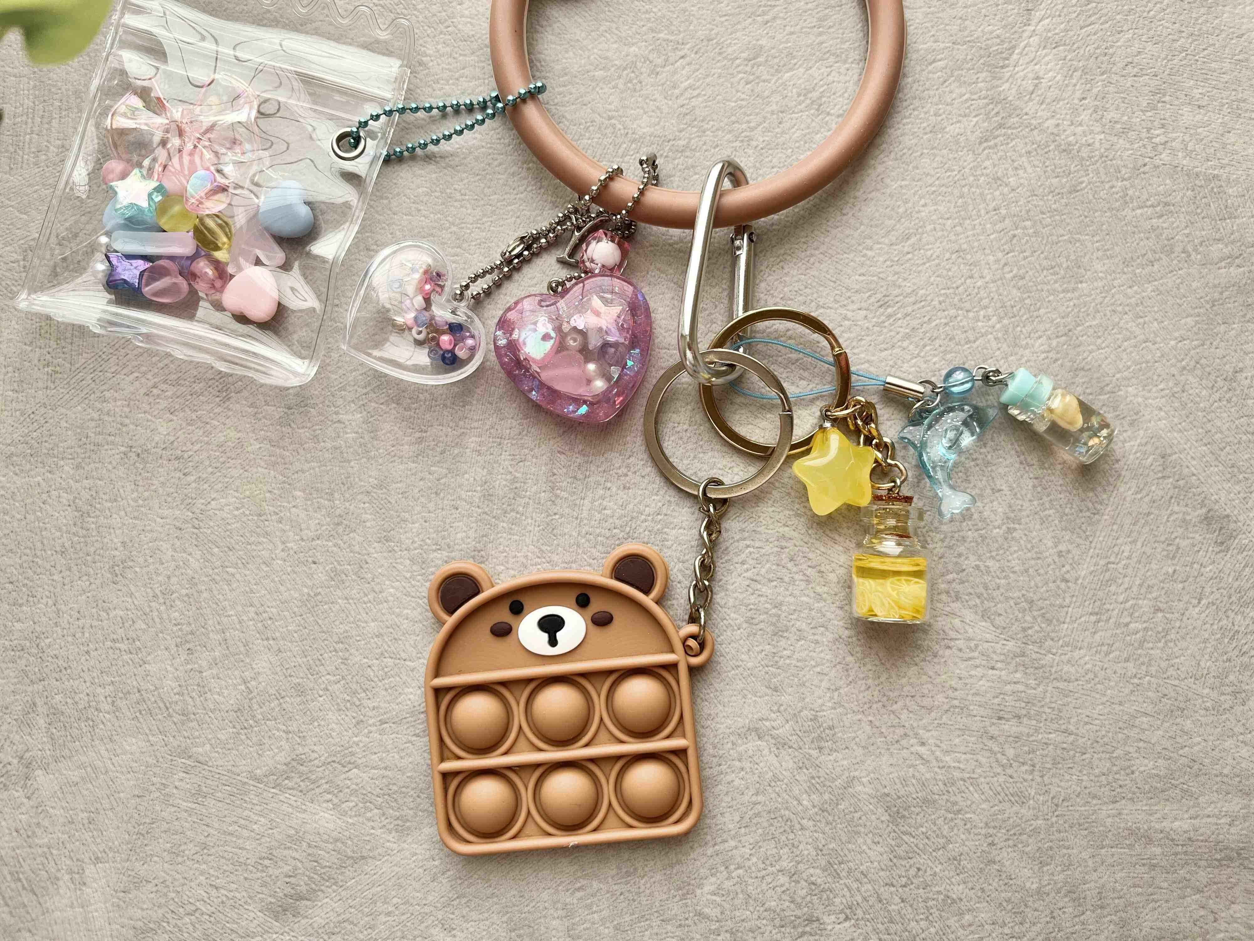 スマホブレスレットの適度な強度と内径約7cmというサイズは、たくさんキーホルダーをつけてもダラーンと垂れ下がることがないので、キーホルダーを収納するのに最適。お気に入りのスマホリングで、可愛くオシャレにキーホルダーを飾りながら収納することができますよ。
