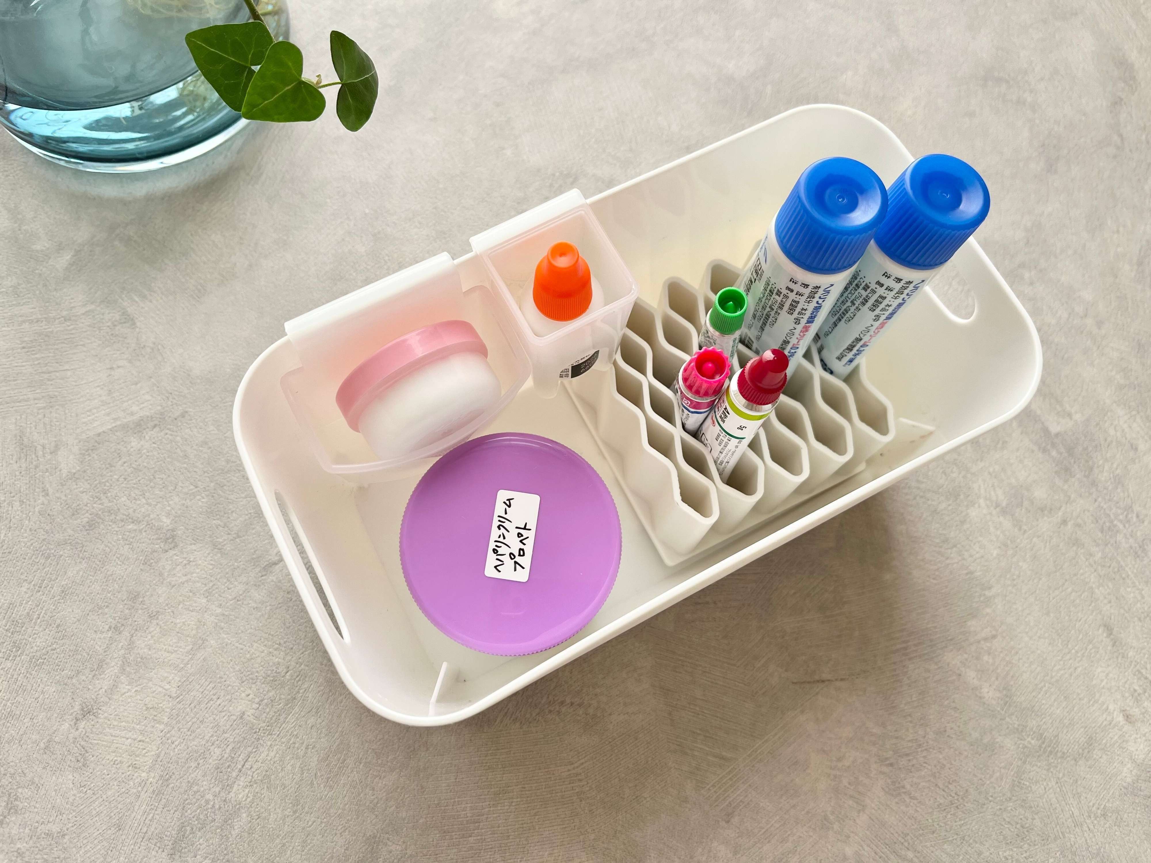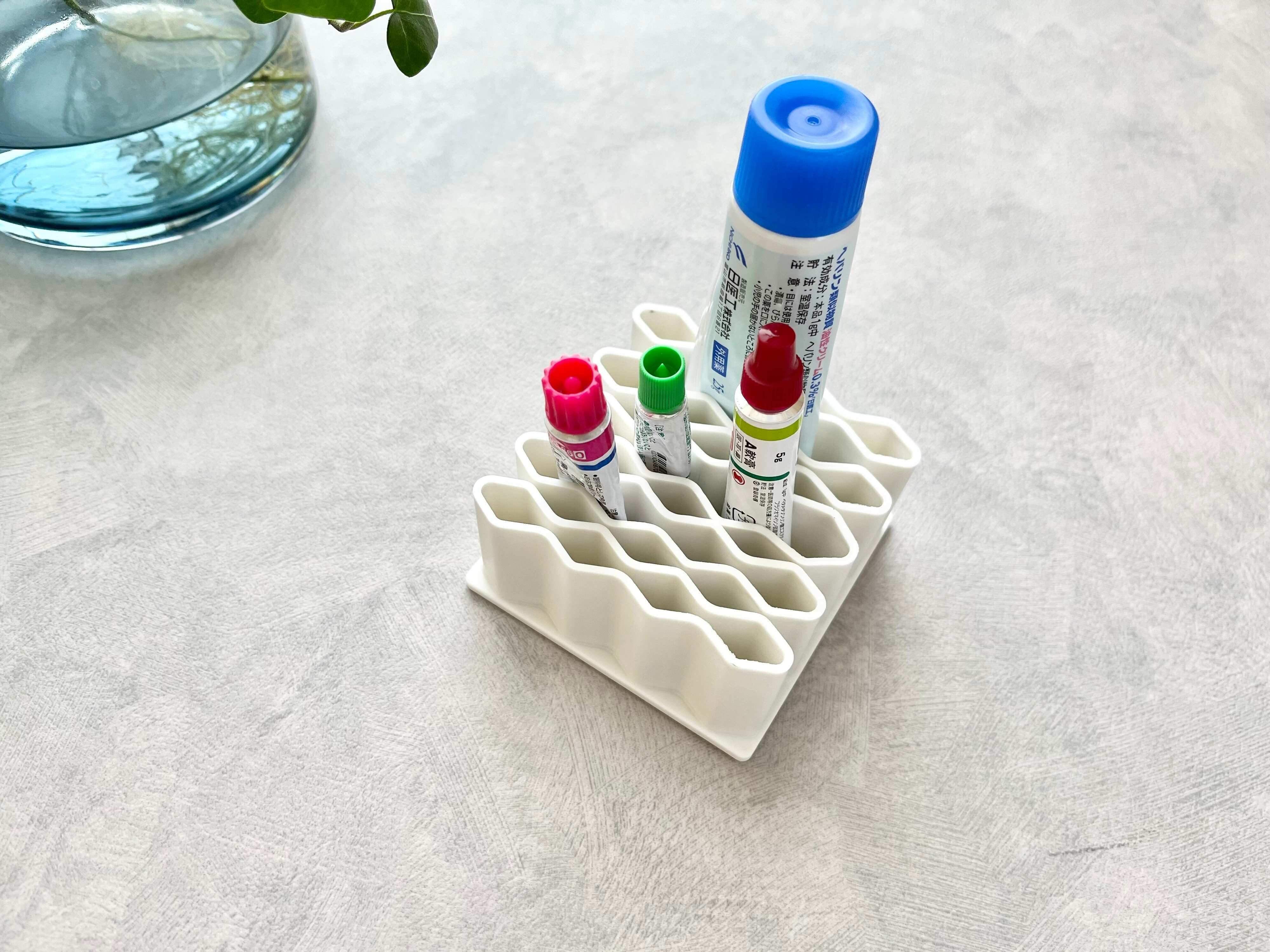 こちらの商品は文房具以外でも、いろんな物の収納に役立ちます。おすすめなのは、チューブタイプの軟膏やハンドクリームなどの収納に。
