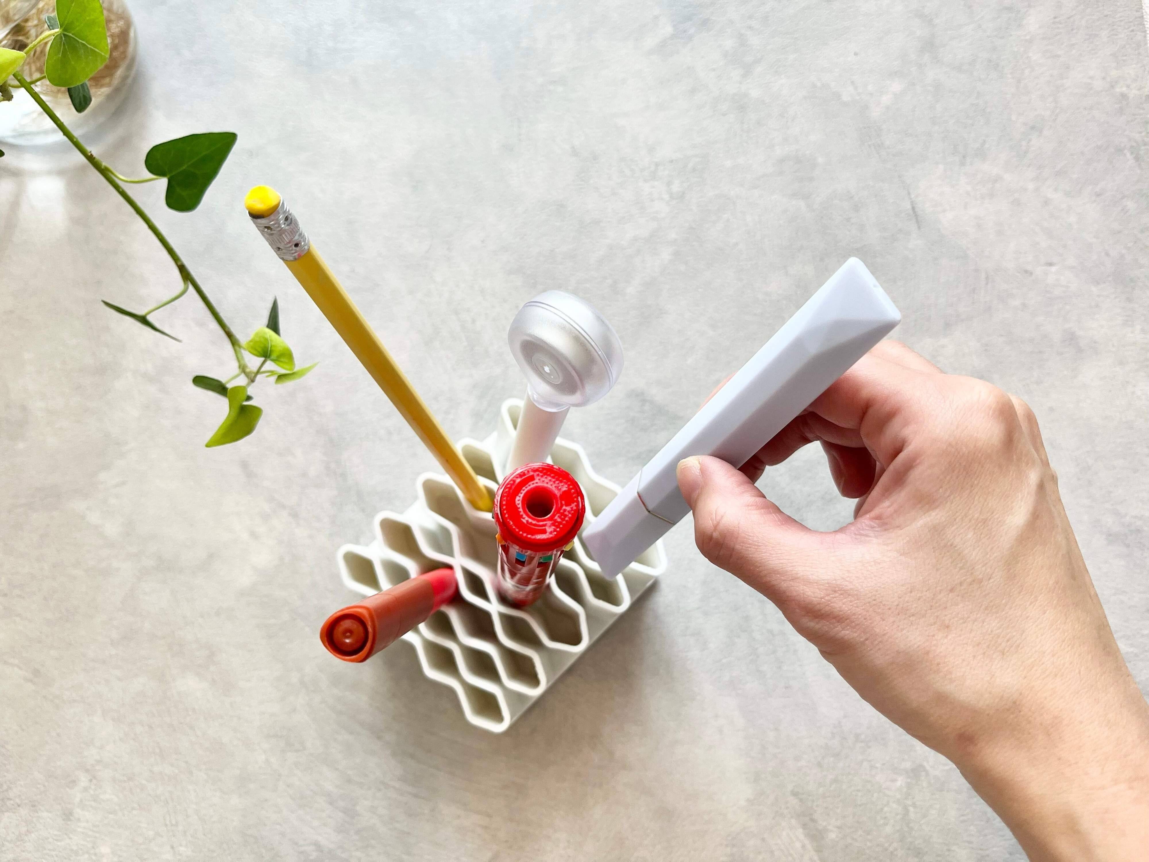 ペンスタンドといえば、まとめて一気に文房具を入れられるケースタイプが多いですが、こちらの商品はひと味違っています。しかも文房具以外の収納にも幅広く活用できる優れものなんですよ!