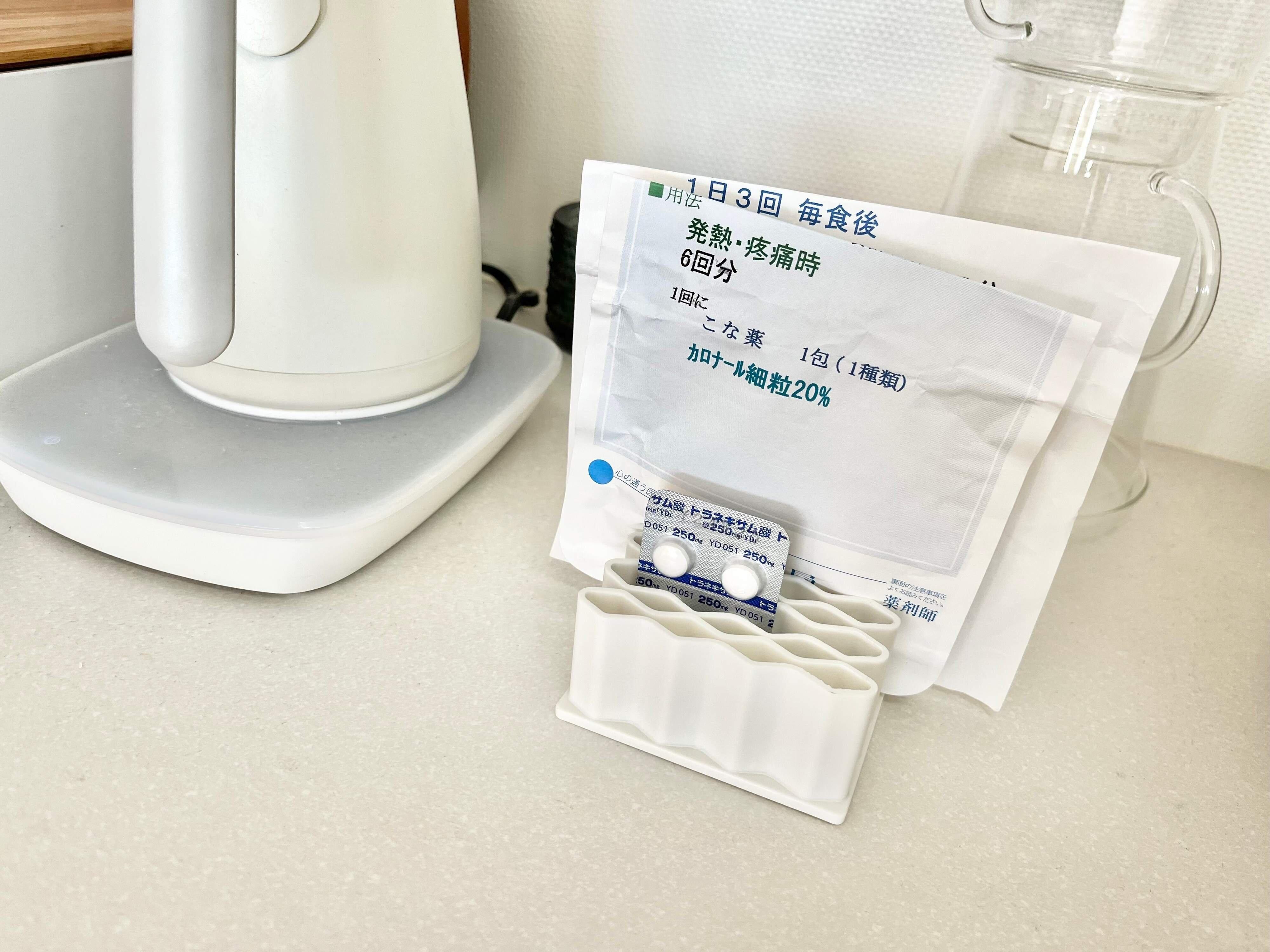 また毎日飲むサプリを置いたり、数日間服用しないといけないお薬の一時置き場としても使用できます。目の届きやすい場所に置いておけば飲み忘れも防ぐことができるので便利です。あとは、ふりかけの袋や紅茶のパックやコーヒーのドリップパックなど、倒れやすい物を立てて取り出しやすく収納することができますよ。