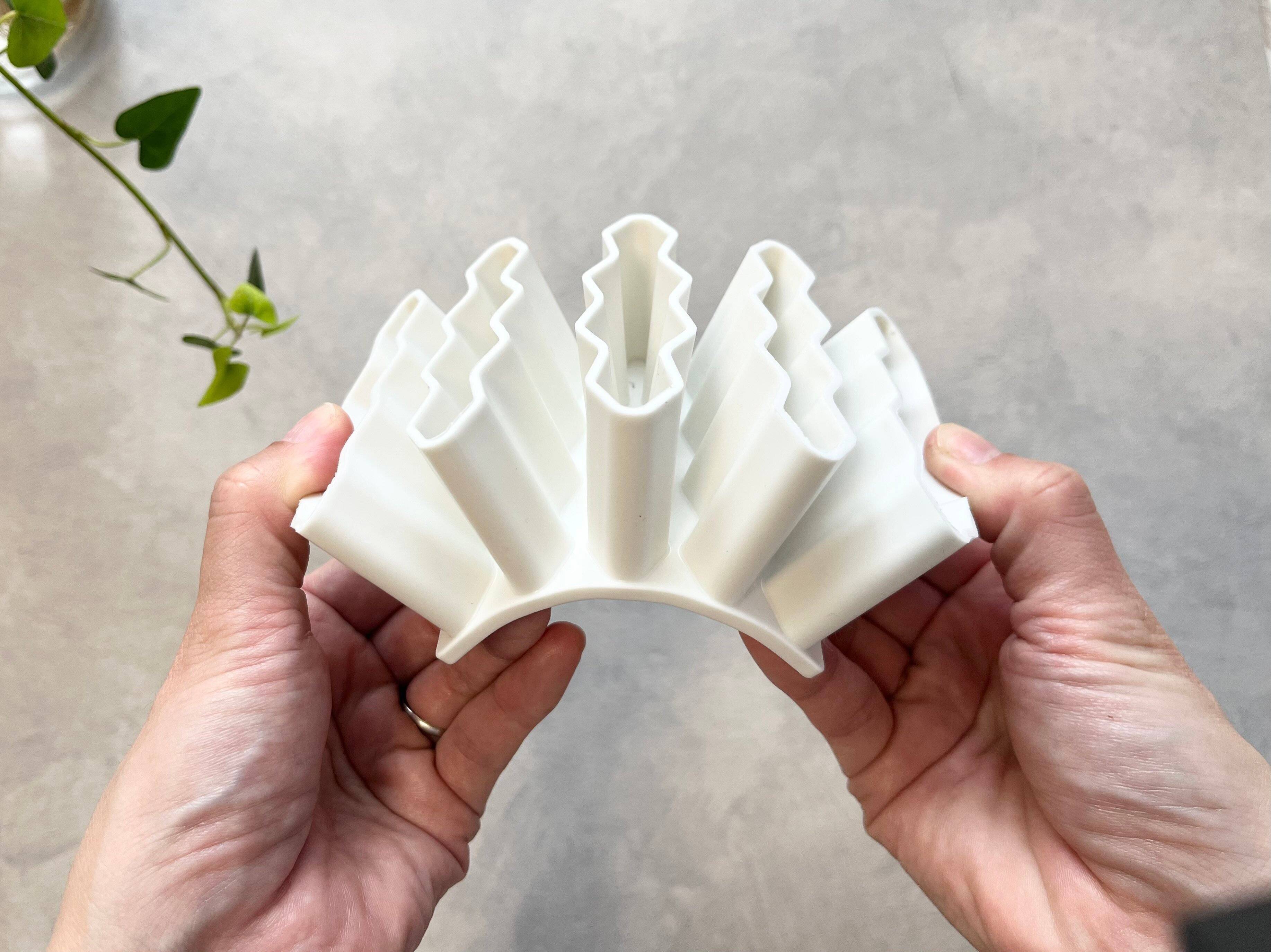 サイズは約8cm×8cm×3.5cm。明らかに普通のケースタイプのペンケースとは違って、うねうねとした層が重なった変わったデザインをしています。このうねうねとした層の間に、ペンやハサミなどの文房具を差し込んで使用します。