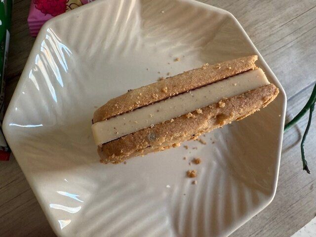 まず一口目に感じるのが、クッキーの“サクッ”とした軽い食感。噛むたびにパリン、と心地よく砕けて、それだけで気分がほぐれる感じ。クッキー自体は甘すぎず、そこにほのかに香るシナモンやクローブが、冬らしいあたたかみをプラス。