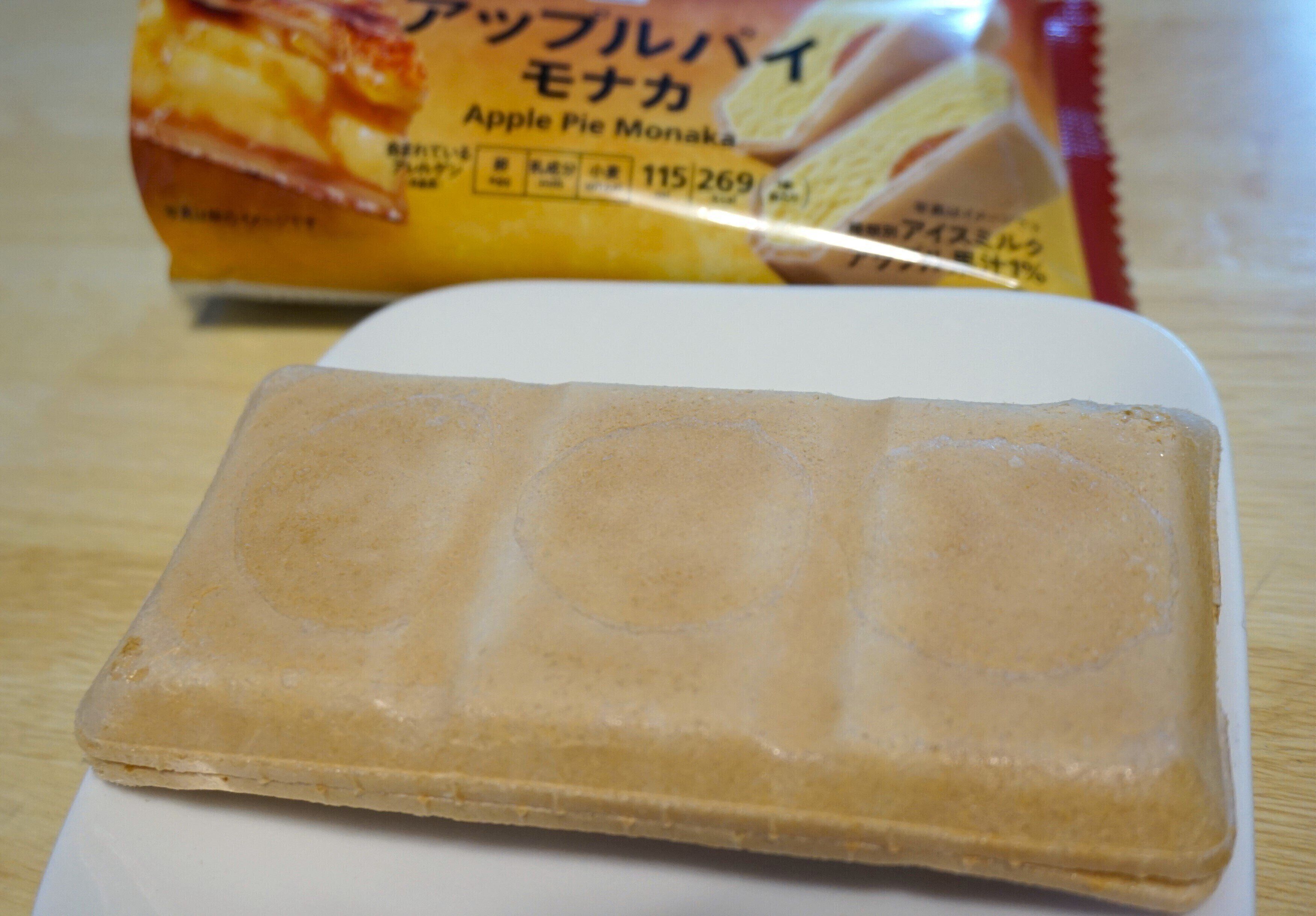 モナカ生地のサクサク感はかなり軽めで、まさにアップルパイの生地とそっくりなんです。よく見ると、モナカとカスタードアイスの間に薄いホワイトチョコがあります。ホワイトチョコでモナカがコーティングされているので、食べる直前までサクサク感を楽しめちゃいます。