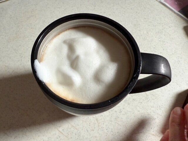 できたふわふわミルクの泡をつぶさないように、コーヒーの上にそっとのせました。