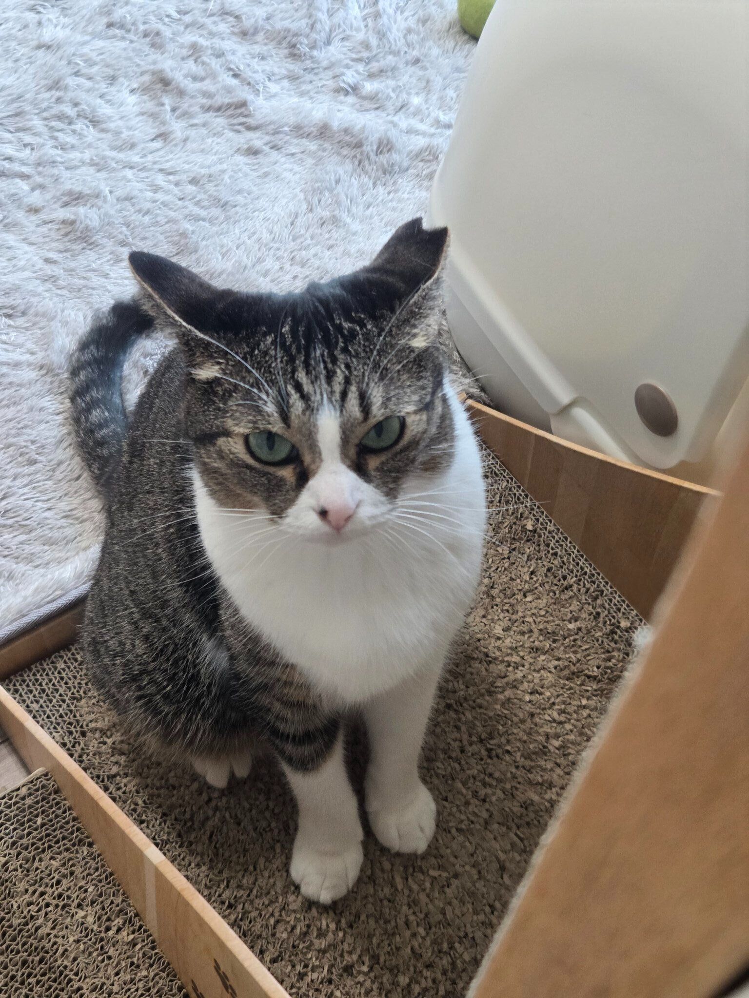 こちらをジーっと見ながらイカ耳を立てている、つくねちゃん。