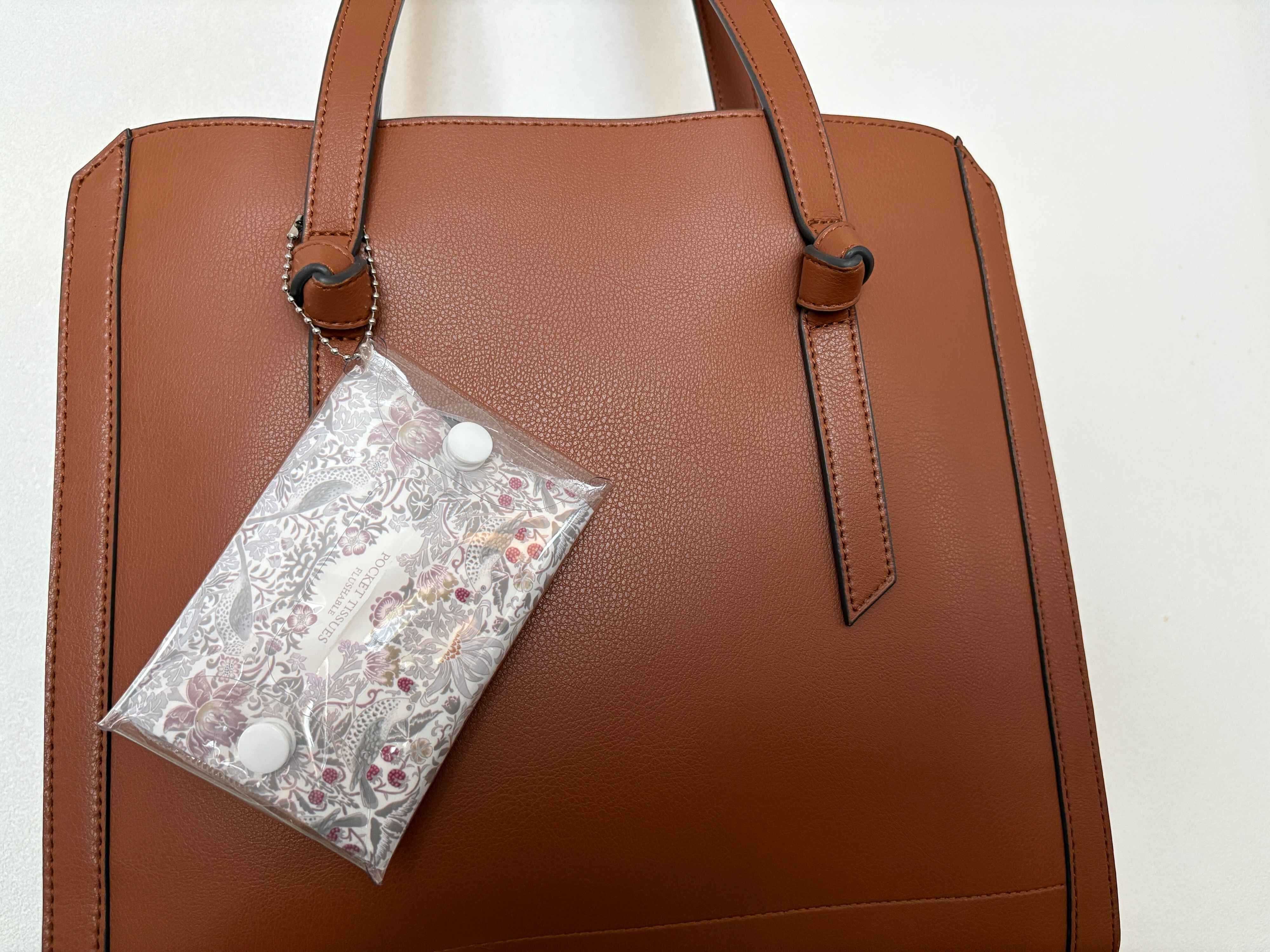 ボールチェーンがついているのも便利なポイント。バッグの持ち手などに取りつければ、バッグの中でポケットティッシュが行方不明になることもありません。