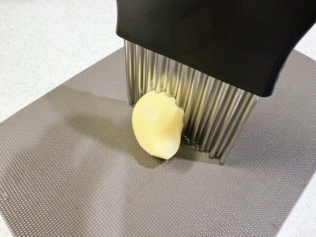 - 歯を90度回転させながら切ることで編目型ポテトもお家で簡単に作れる。