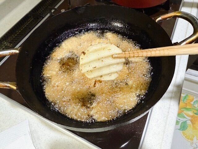 早速、カットしたポテトを調理してみます。今回は子ども達の大好きなフライドポテトを作りたいので油で揚げてみました。