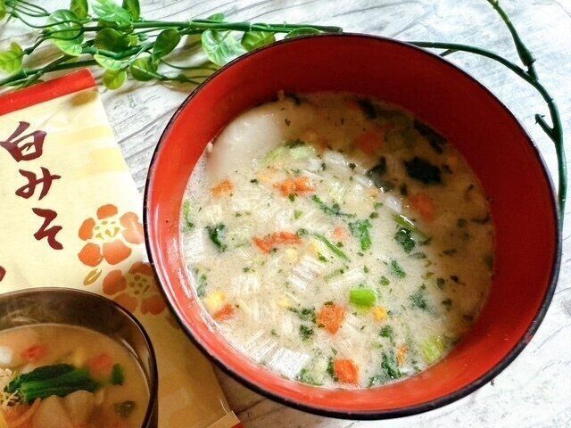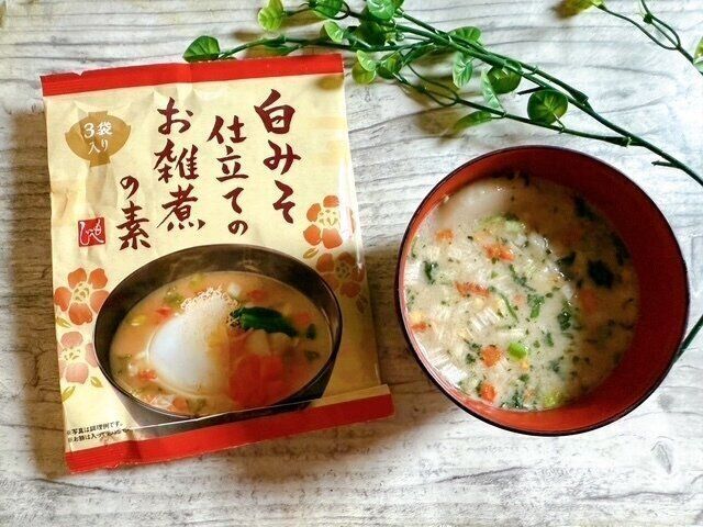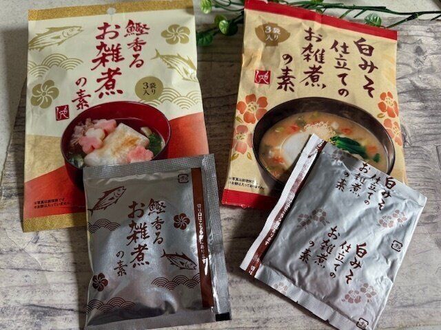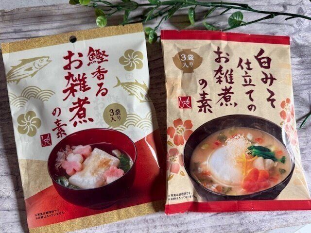- かつお風味を利かせた「白みそ仕立てのお雑煮の素」なんと4種の具材入り