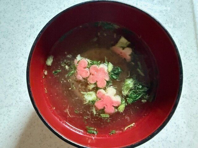 入れてみてびっくり。すごく具だくさん。紅白の桜型のお麩がなんとも可愛らしい。