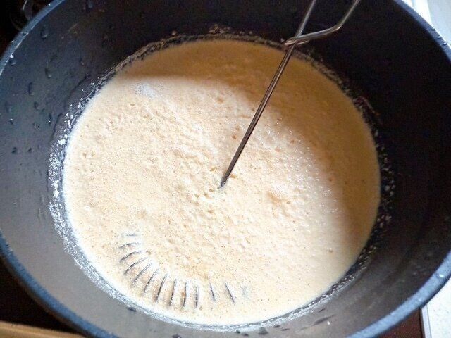 火にかけ、素がしっかり溶けるまでよく混ぜます。混ぜていくとだんだんと黄色みがかってバニラビーンズの良い香りがしてきました。よく見ると、黒いつぶつぶも見えます。素ですが、しっかりバニラビーンズが入っていて本格的。
