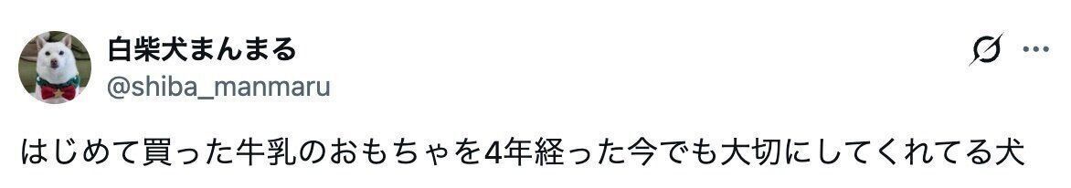 白柴犬まんまるさん(@shiba_manmaru)が投稿したのは、愛犬まんまるくんと、愛用しているおもちゃの写真。生まれて初めて買ってもらったおもちゃを、4年経った今でも大切に使う愛しい姿に、11万件ものいいねが集まり話題になりました。