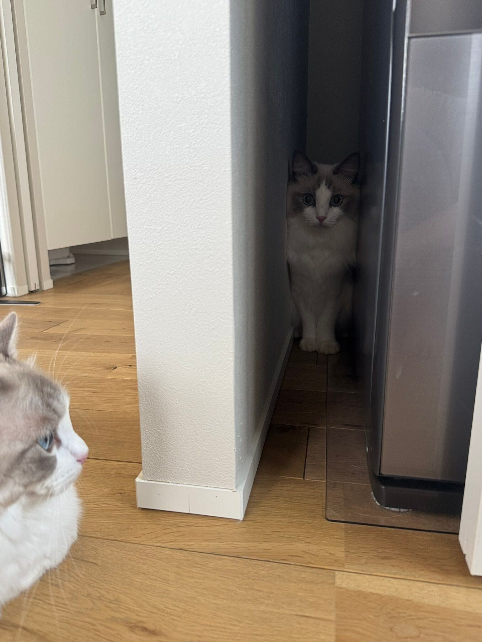 ひょっとすると、ニコくんにしてみれば普段と変わらずすき間でくつろいでいたところだったのかもしれませんね。突然扉が閉められたら、それはたしかにビックリするかも……。