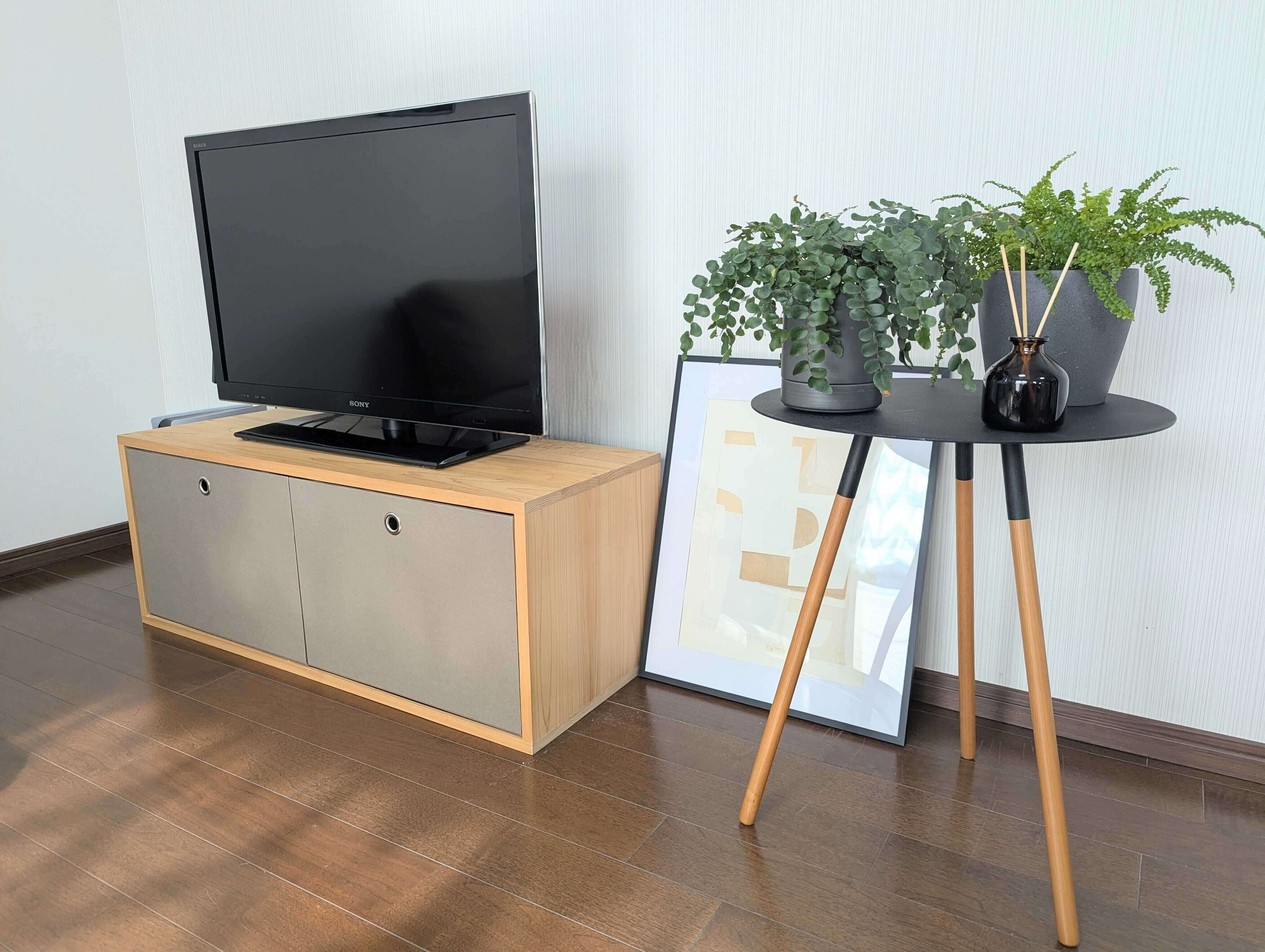 意識しているのは、料理の香りと混ざらない距離感。キッチンやダイニングテーブルから少し離れた、テレビ台横のスタンドに配置しています。観葉植物とならべることで、インテリアのアクセントにも◎。