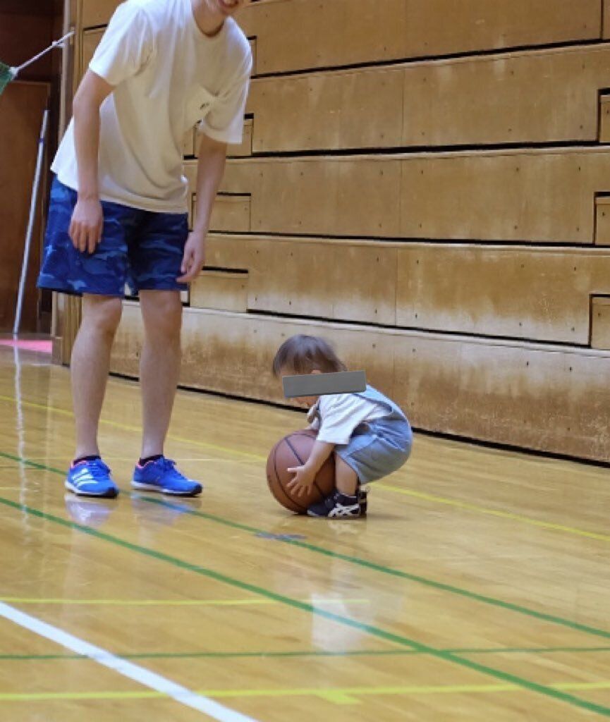 「会社の同期や先輩とバスケをしようと約束があり、息子もいっしょに体育館に行きました。元からボールが好きな息子はバスケットボールにも夢中で、転がってきたものを持とうとしていました」