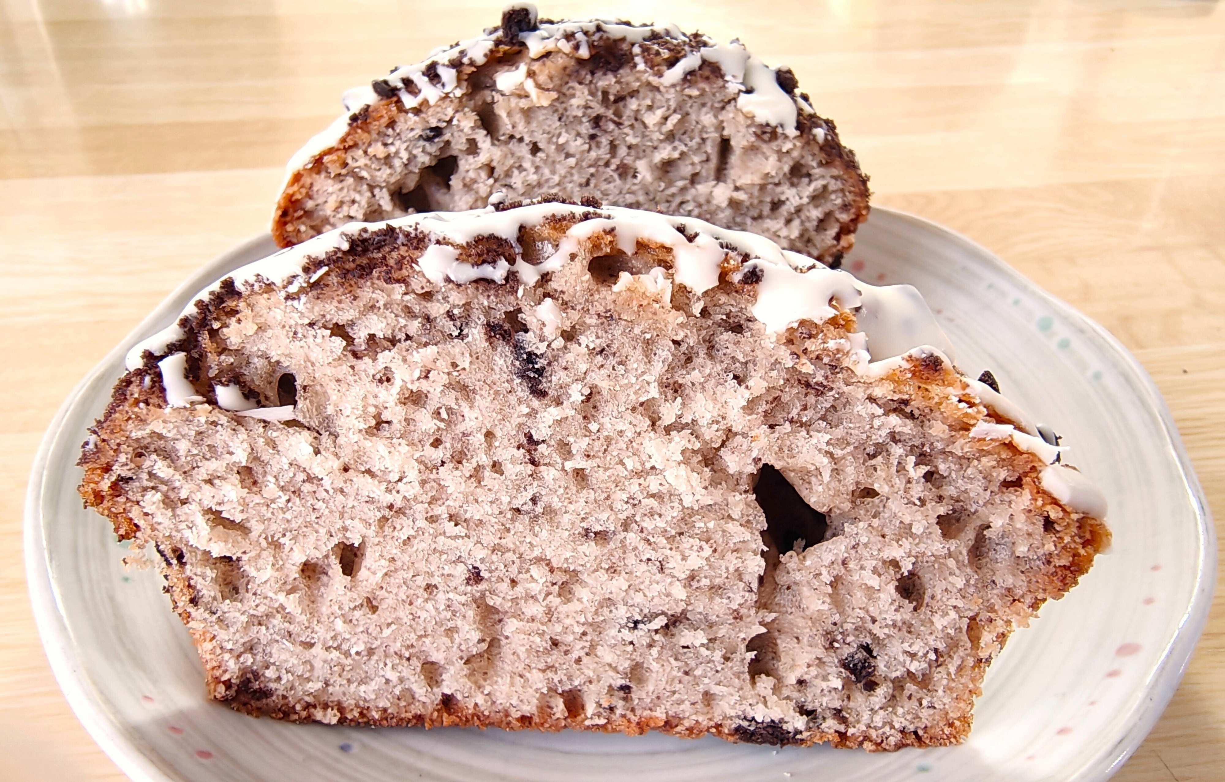 上には濃厚なホワイトチョコレートとココアクッキーがトッピングされていますが、マフィン自体がほんのり塩気も感じる控えめな甘さなので、バランスがいいようです。生地にはところどころにココアクッキーが入っていて、ほろ苦いココアの風味です。