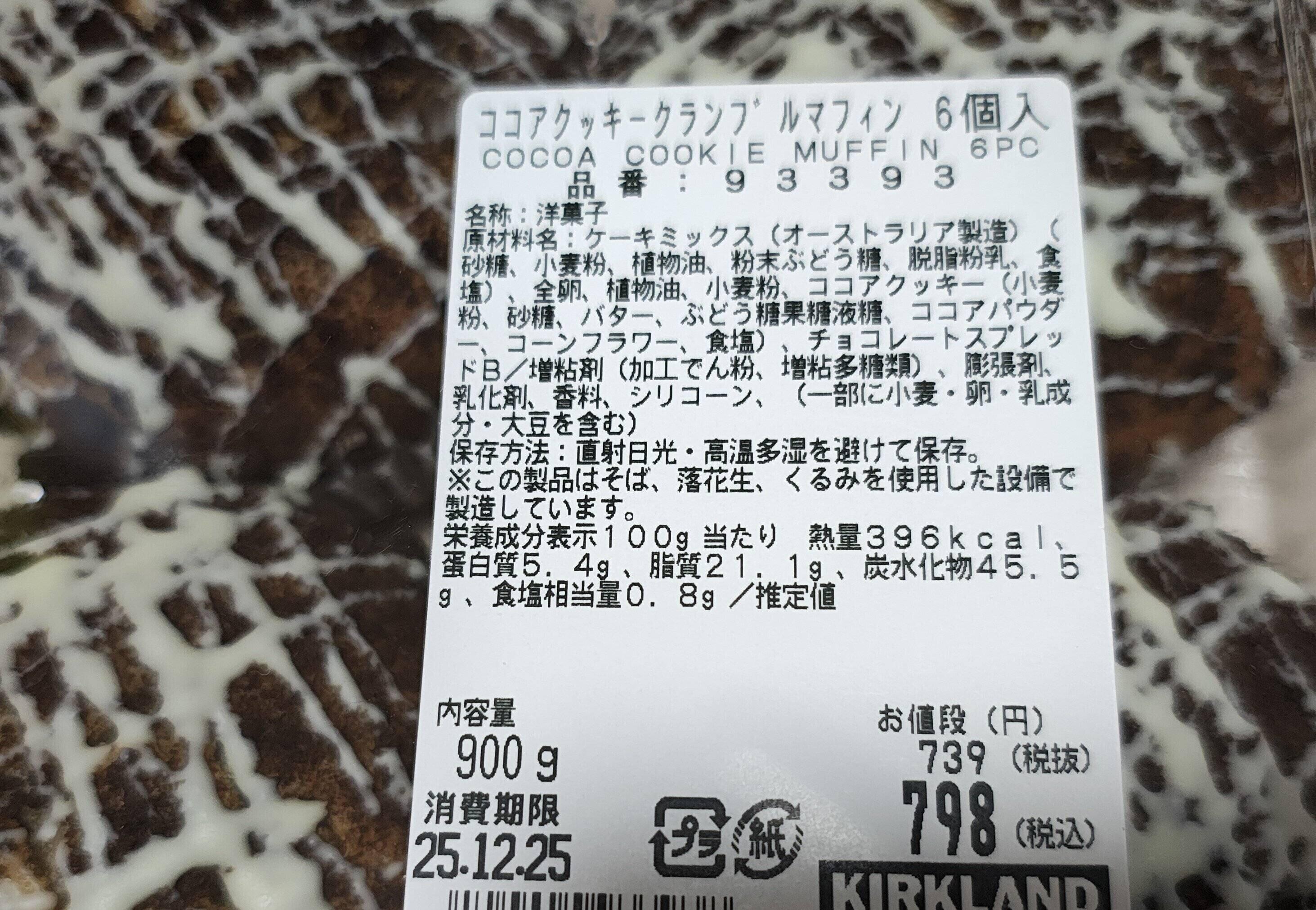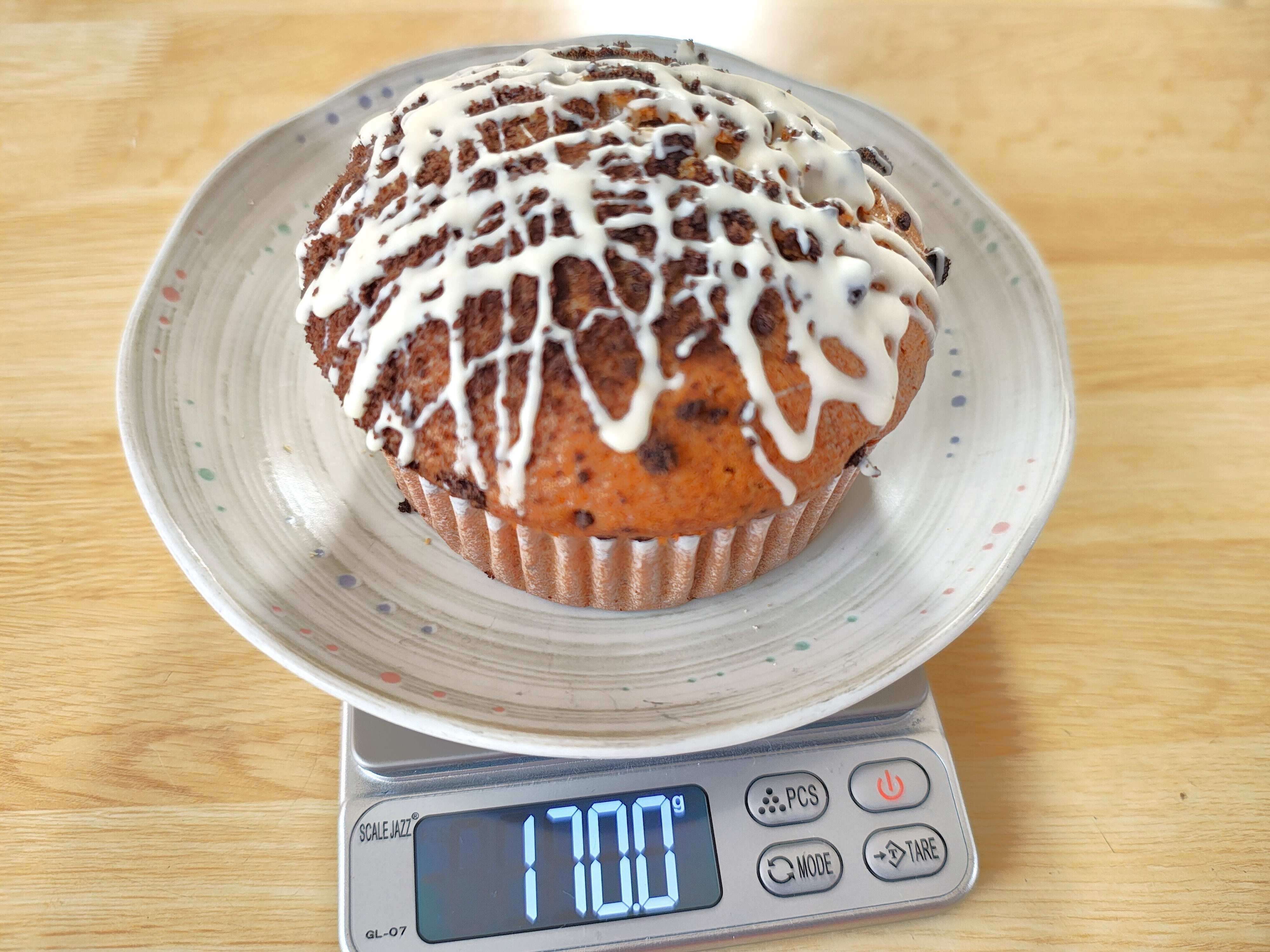 コストコといえば、アメリカンサイズの巨大マフィン。「ココアクッキークランブルマフィン」の重さを量ってみたところ170gでした。170gだとすると1つあたりのカロリーは、およそ673kcalとかなり高め。