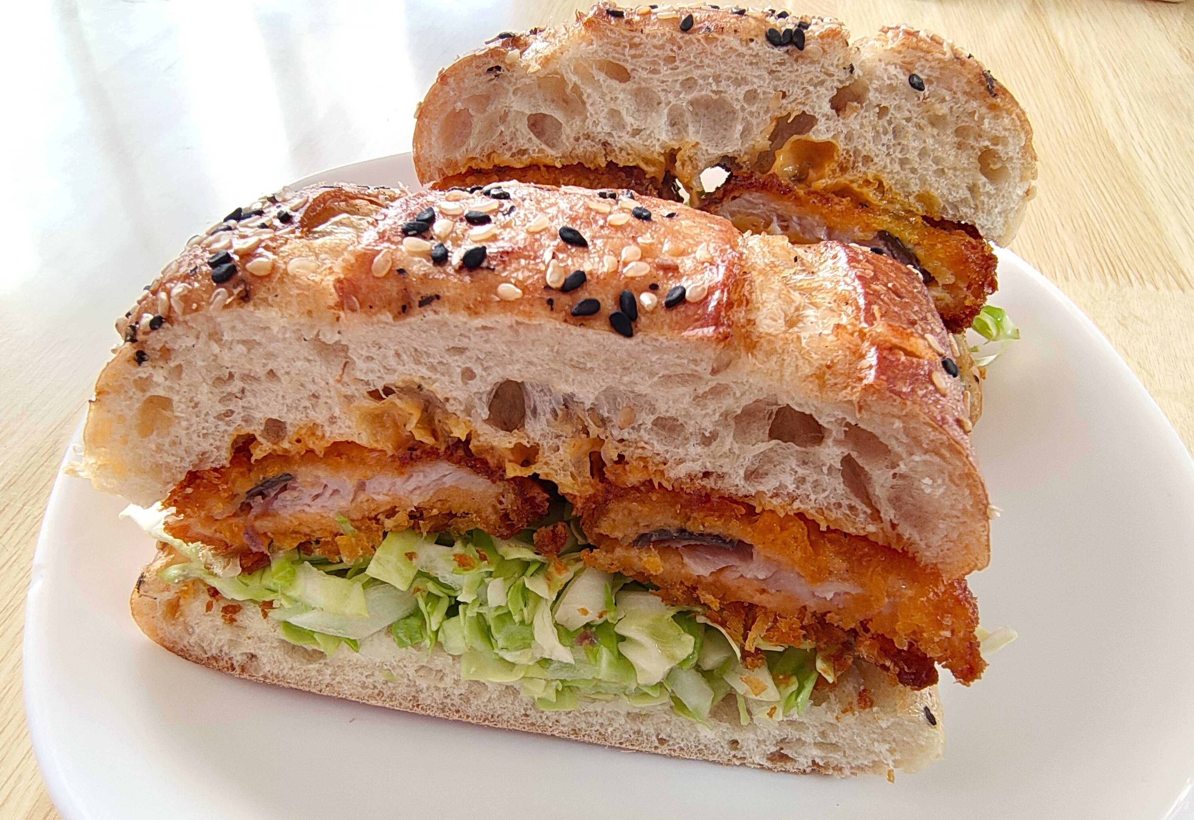 大判サイズを活かして、今回は贅沢に鮭フライを2枚サンドしてみました。野菜もたっぷり挟めば、見た目も豪華なランチの完成。お弁当として持ち歩いても、パンがパサつかず最後まで美味しくいただけました。