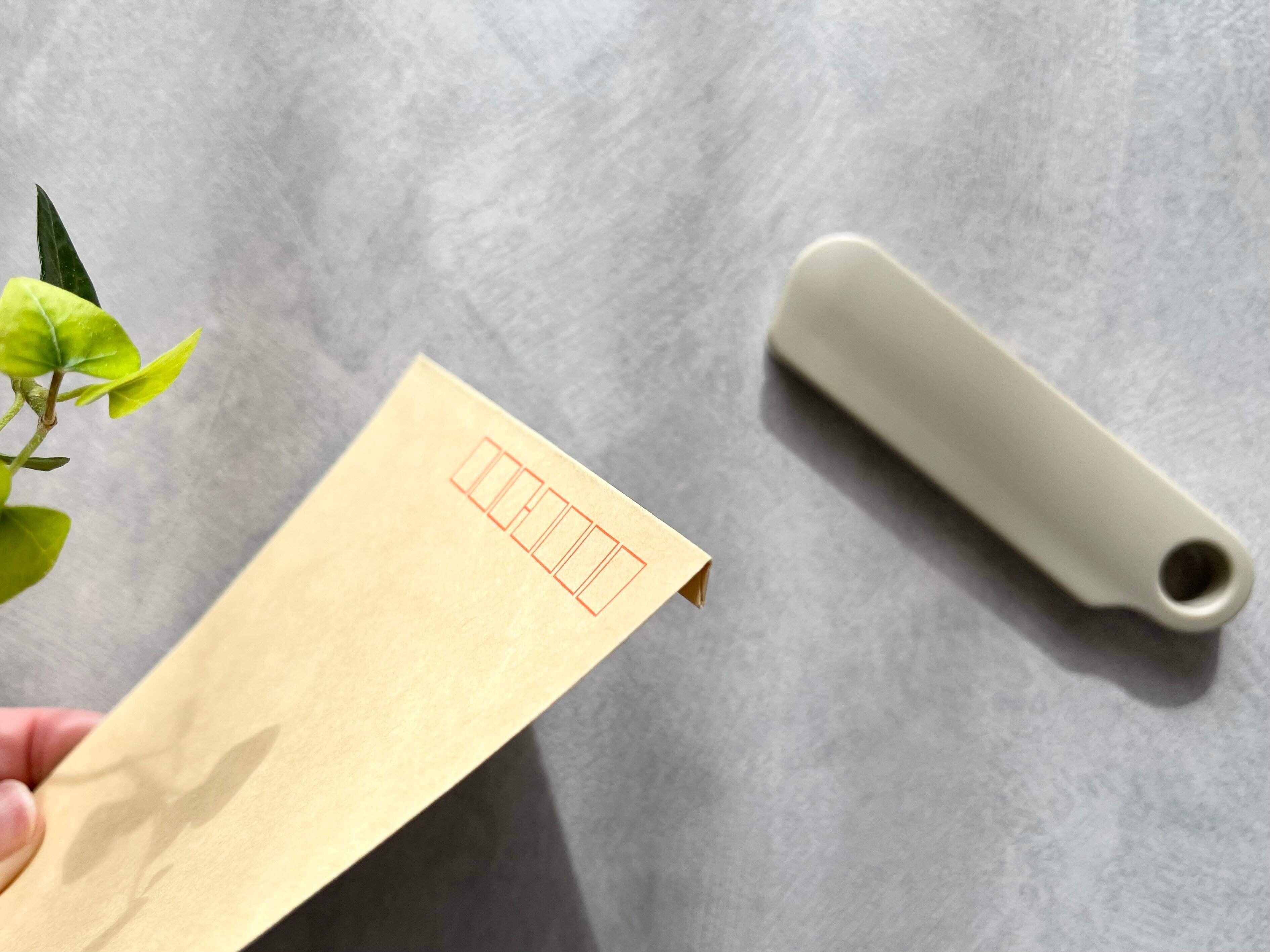 使い方はとっても簡単です。まず封筒の開け口を軽く折ります。この折り目が刃が当たるガイドラインになるので、切りたい位置に折り目を付けます。
