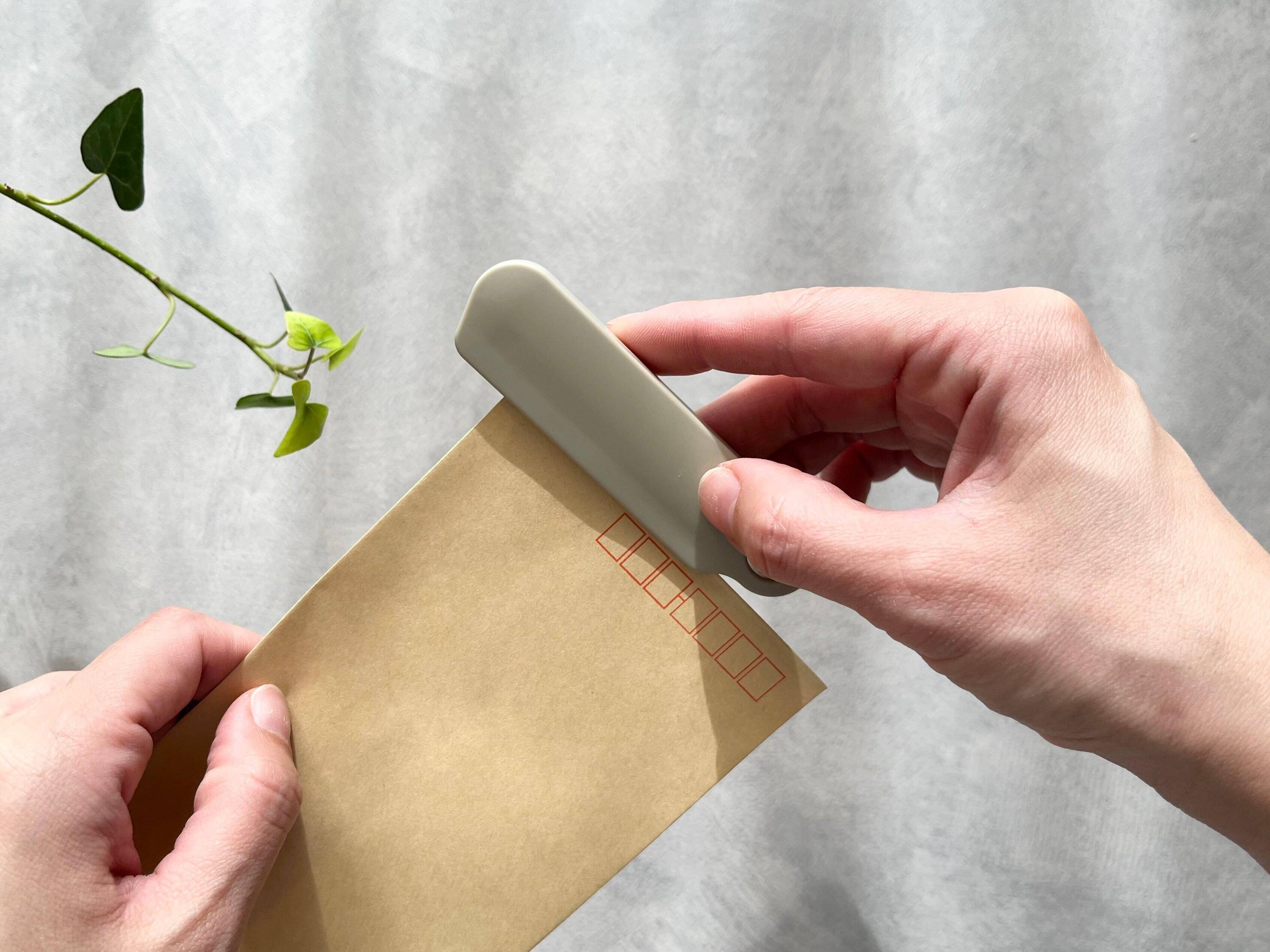 するとたったこれだけで、封筒を簡単に開封することができます。ハサミで切ると切り口がガタガタになってしまったり、一般的なカッターだと刃で手を怪我してしまうなんてこともありますが、スライドするだけでサッとスムーズに真っ直ぐ綺麗に切ることができます。