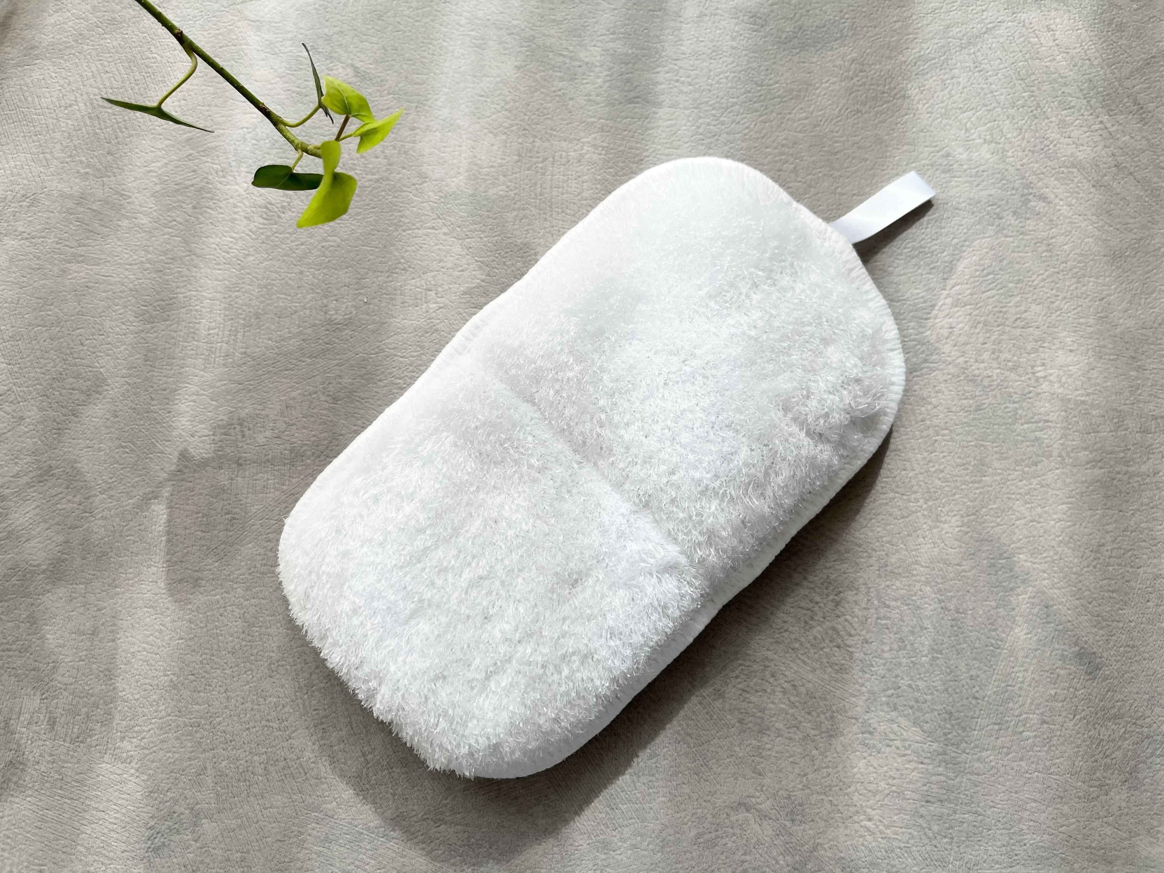 商品のサイズは、約10cm×18cm×2.5cm。一般的なスポンジよりも少し薄くて大きいサイズをしています。そして表と裏でそれぞれスポンジの素材が違うのも特徴的。片方の面は、細かい繊維がギッシリ詰まった独特な素材をしています。