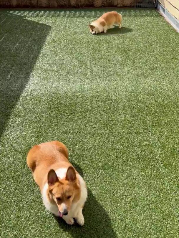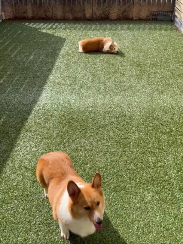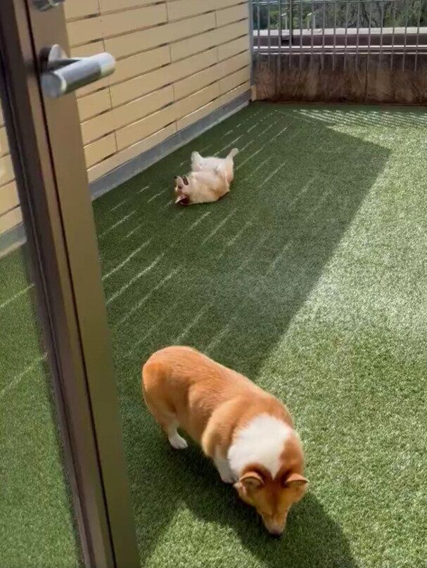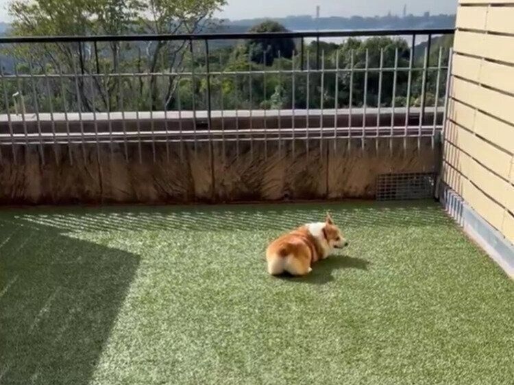テラスに出たコーギーの反応にクスッ