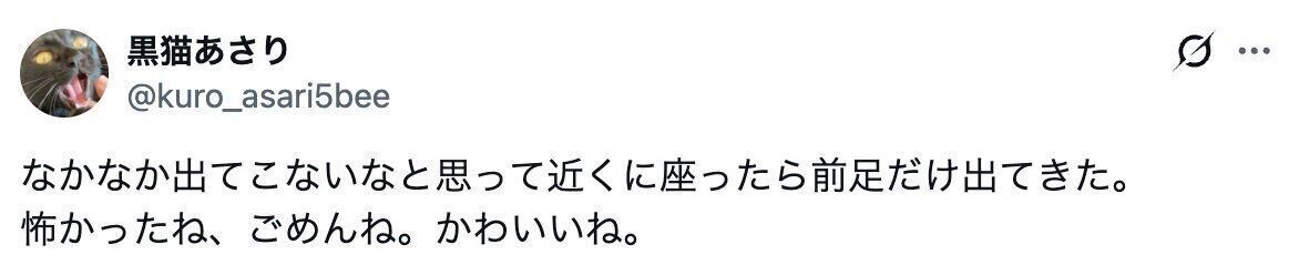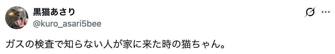黒猫あさりさん(@kuro_asari5bee)が投稿したのは、ガス検査のため専門家が訪れたときのこと。怖がって隠れてしまった愛猫・あさりちゃんでしたが、飼い主さんにだけ見せたある行動が「かわいすぎる」と、25万人が悶絶し話題になりました。