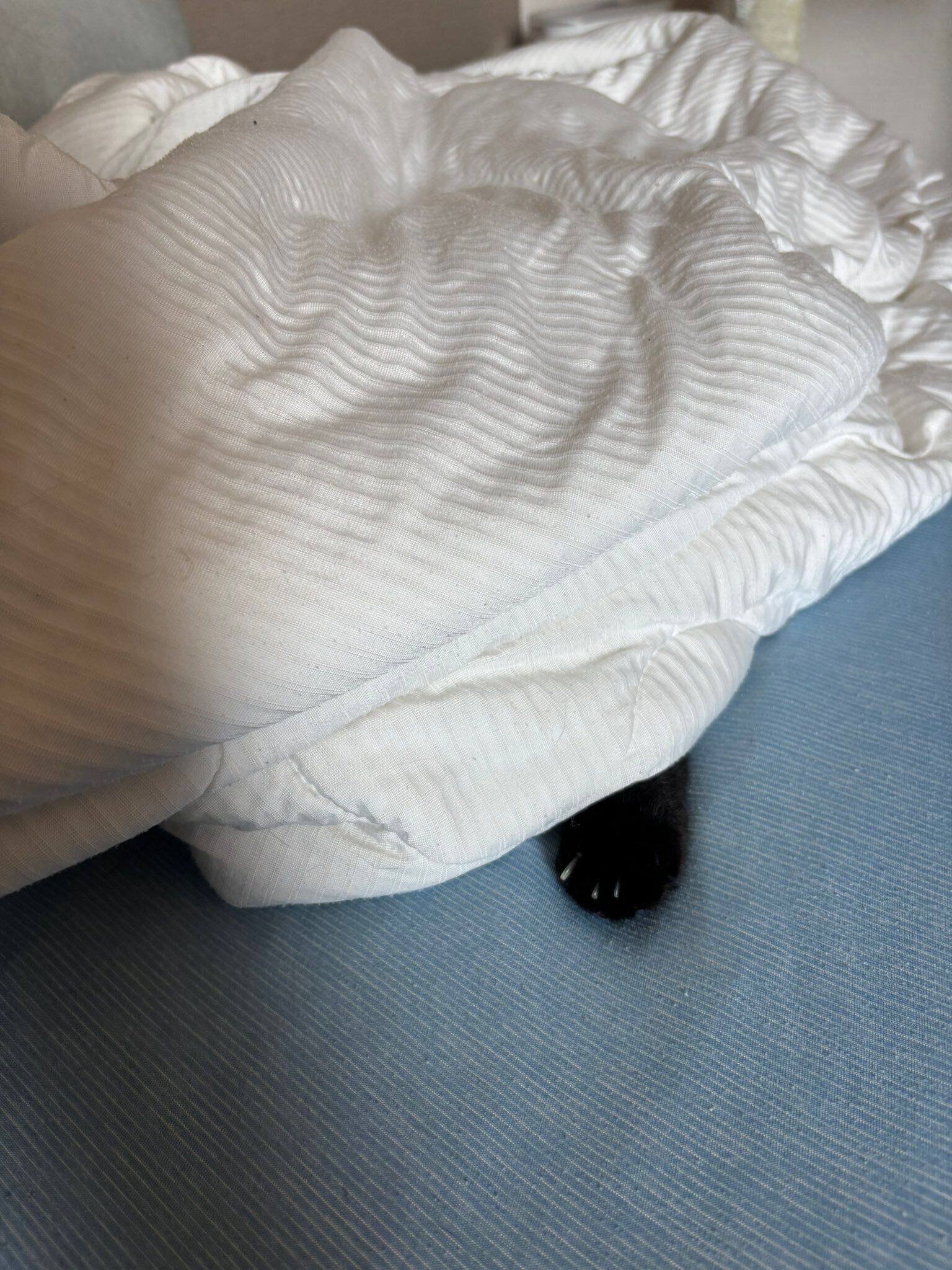 「人の気配に敏感な子なので、チャイムが鳴った時点で高いところに逃げ、ガスの専門家さんが室内まで入ってきたら、布団に潜り込んでいきました。専門家さんが帰ってからも、しばらく出てこなかったため、寝ているのかな?と思い近くに座ったら、確認するように前足が出てきました」