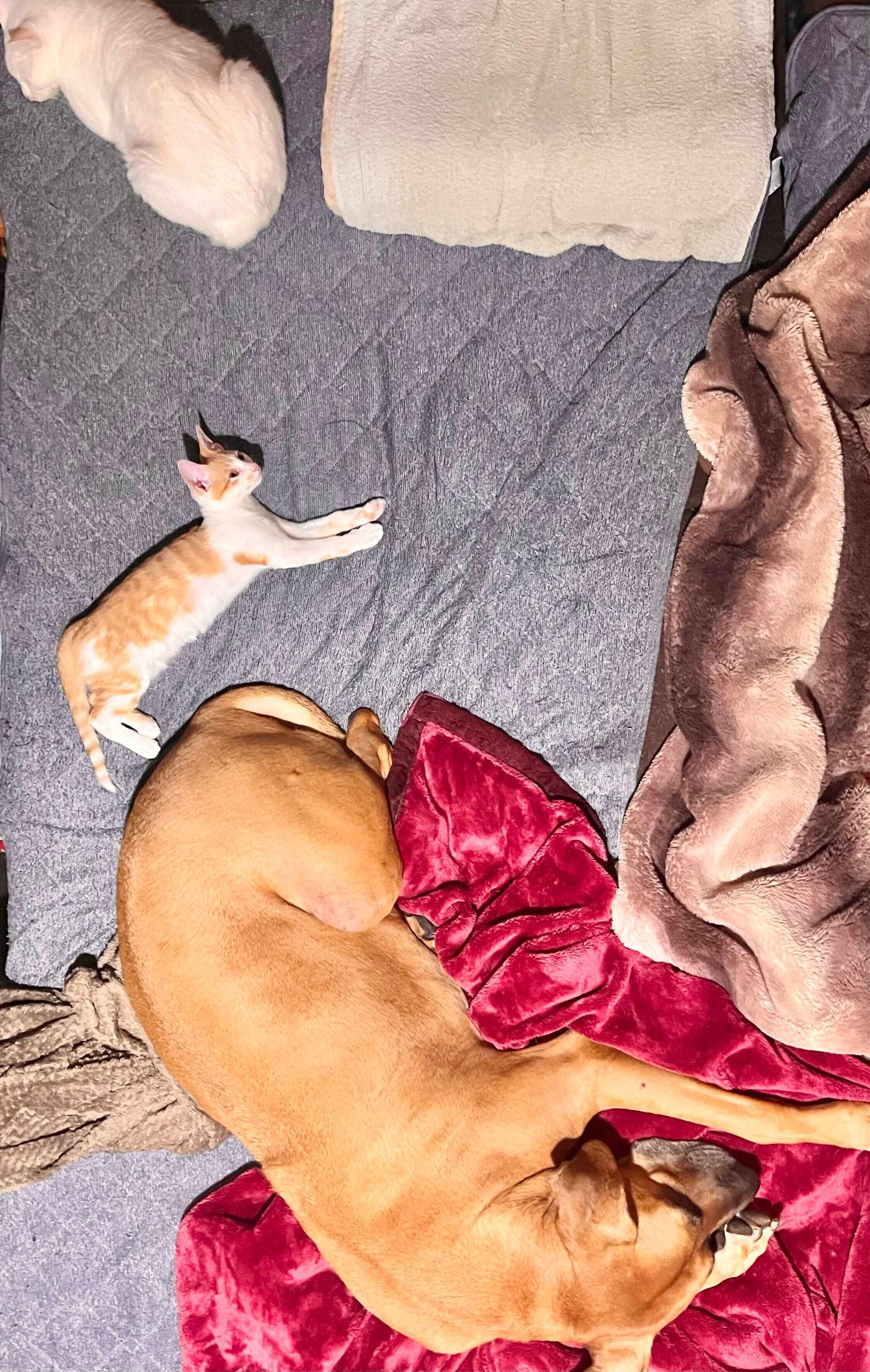 枕のすぐ横にいたのは丸くなったネコリアンちゃん。そこから少し下がった位置には、小さな前脚を前方に伸ばしたマザリアンちゃんが。そしてさらに下の位置に、毛布を2枚抱え込んでいる犬くんがいます。