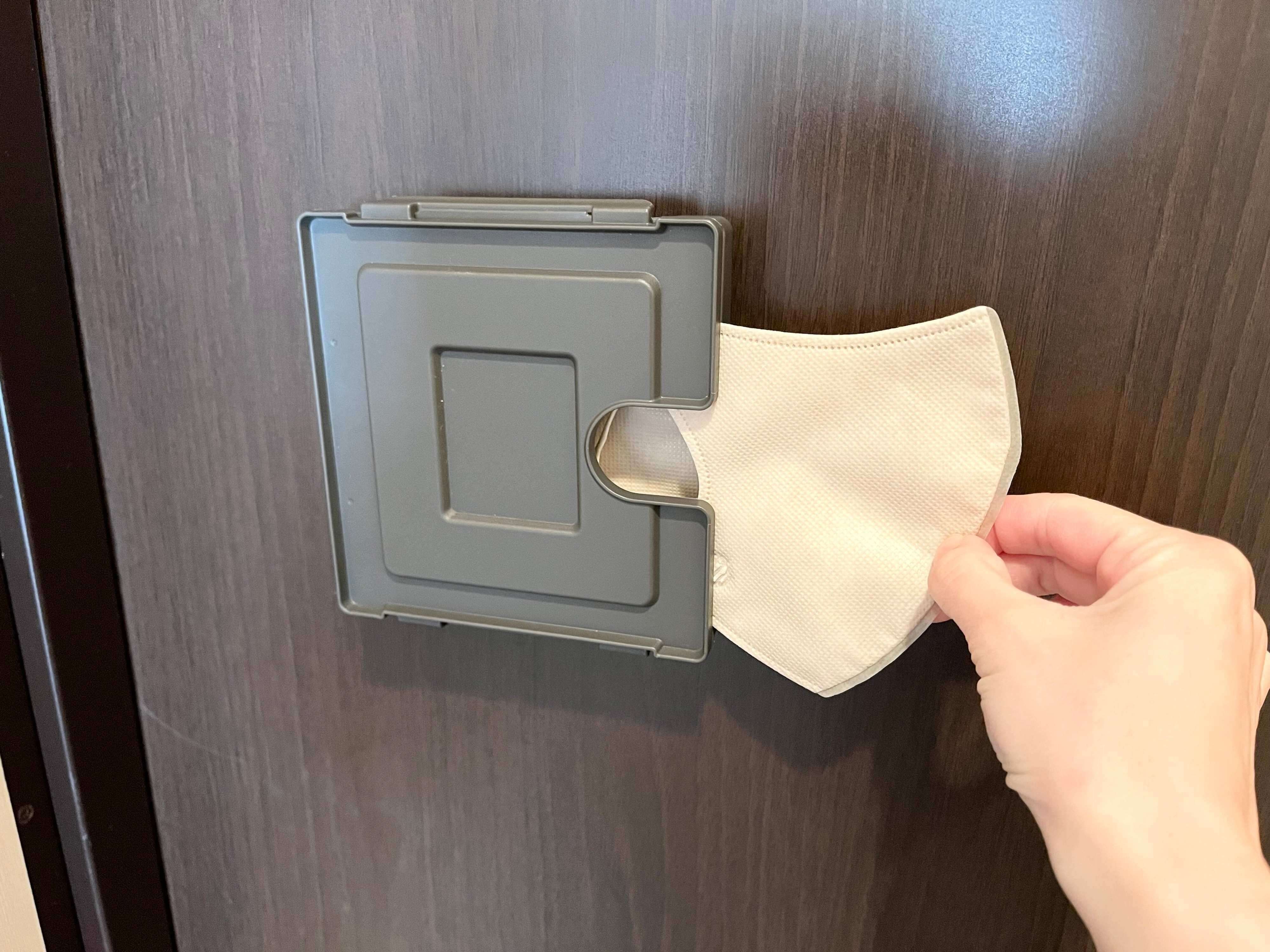 というのは、玄関のドアという外出時に誰もがとおる場所に取りつけることで、マスクを忘れるのを防ぐことができるからです。