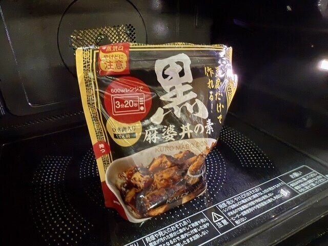 - 豆腐を入れてレンジ加熱するだけでひき肉入り本格派黒麻婆豆腐