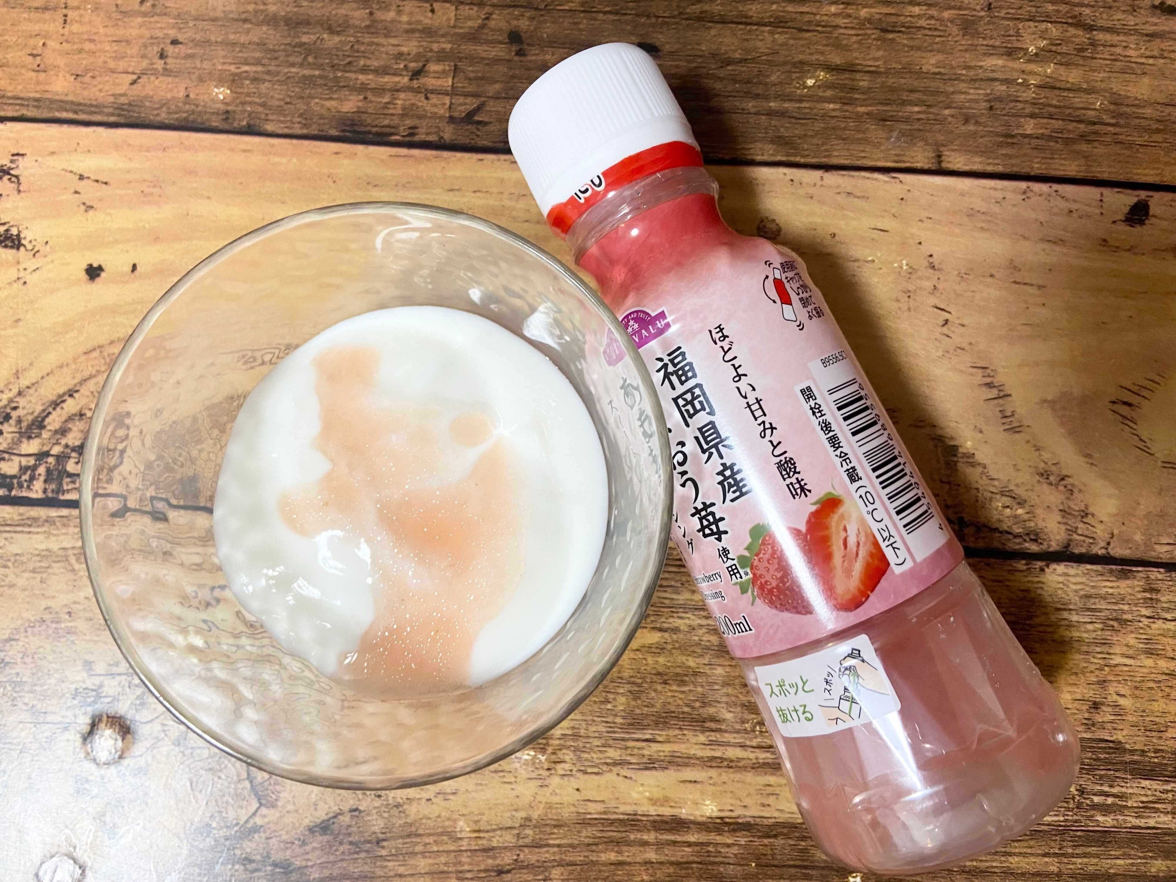 「福岡県産あまおう苺使用 スイートドレッシング」をプレーンヨーグルトにかければ、甘さは控えめだけれどいちご感を感じられる味に。ドレッシングなので、いちごジャムやソースと違って甘味はなく、さっぱりとしたヨーグルトに仕上げてくれます。