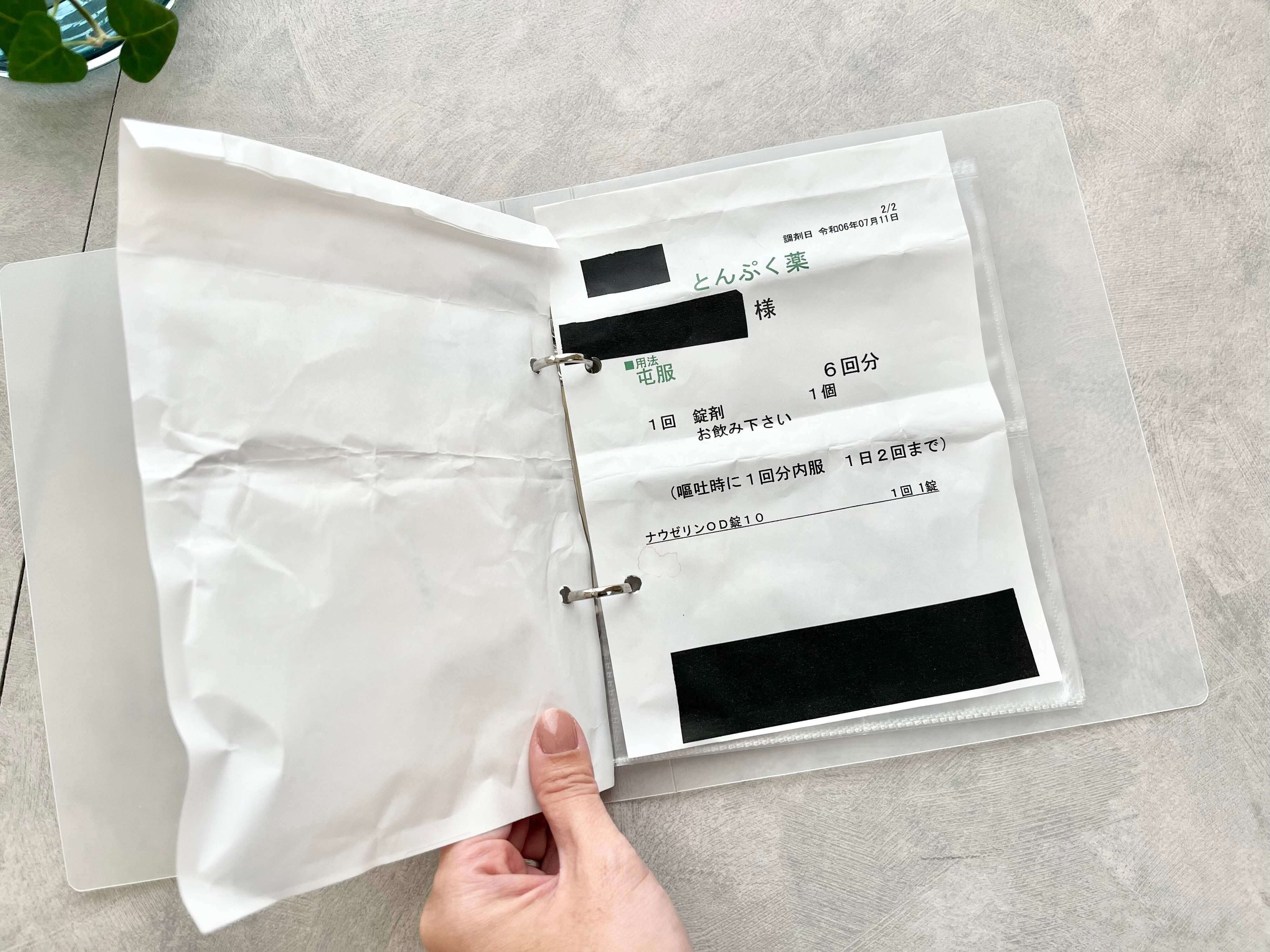 注意点として、トレーディングカードホルダーはA5サイズのものを挟むのにちょうどいいサイズなので、それ以上の大きい薬袋を挟むとはみ出してしまうということ。