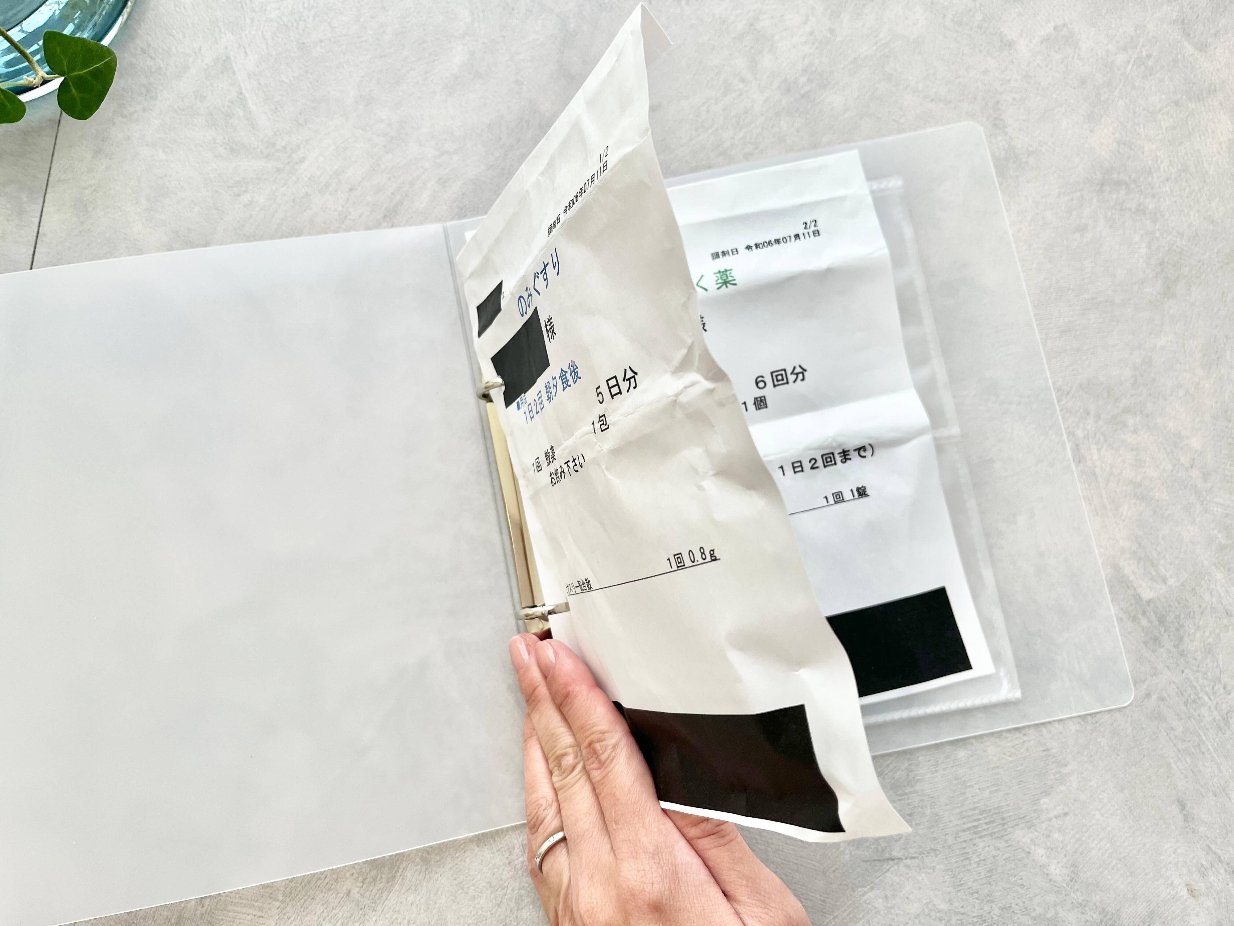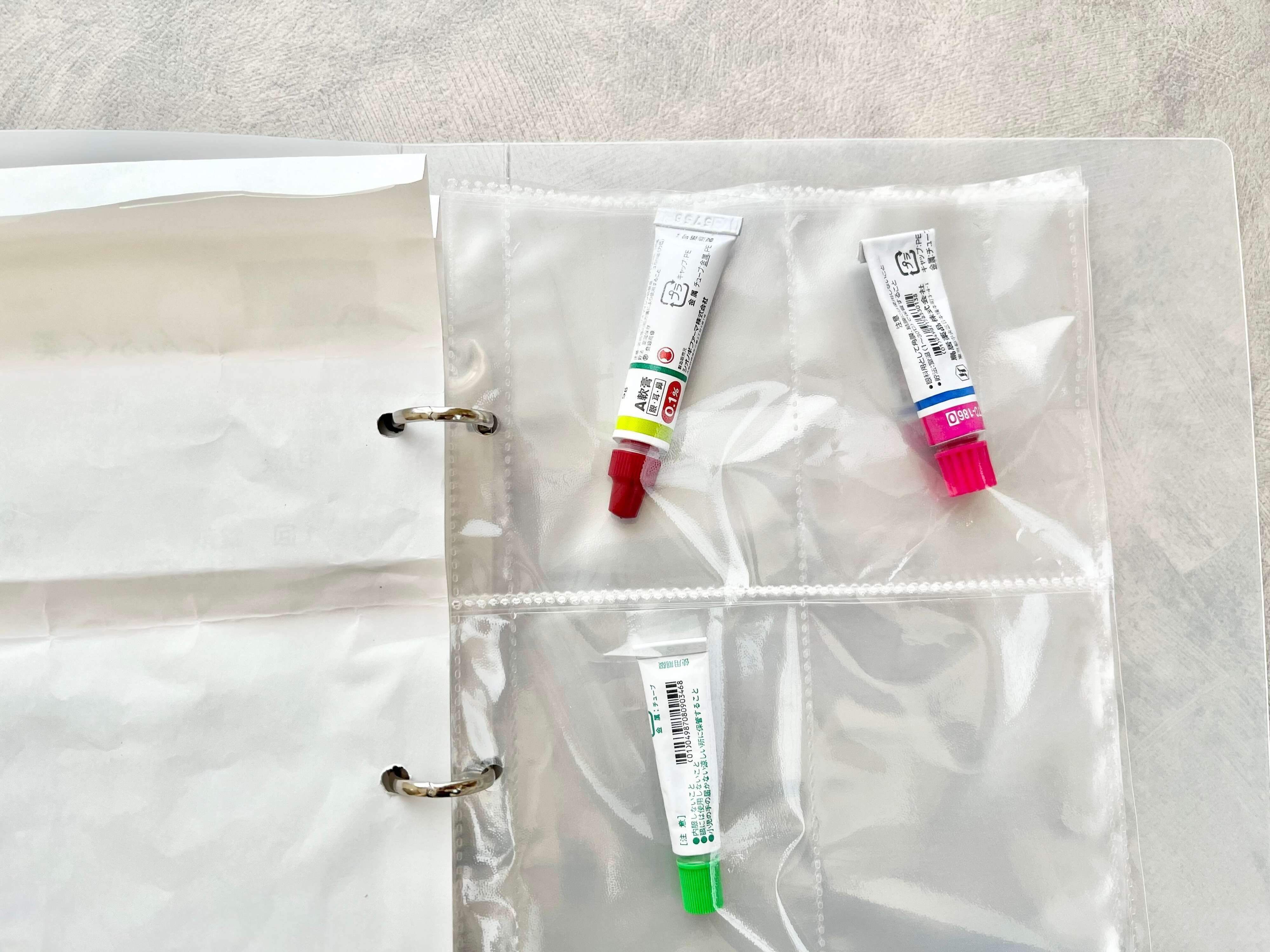 今回ご紹介した「薬」収納術は、薬袋にパンチで穴を開けてトレーディングカードホルダーに挟むだけという、とてもシンプルな方法です。