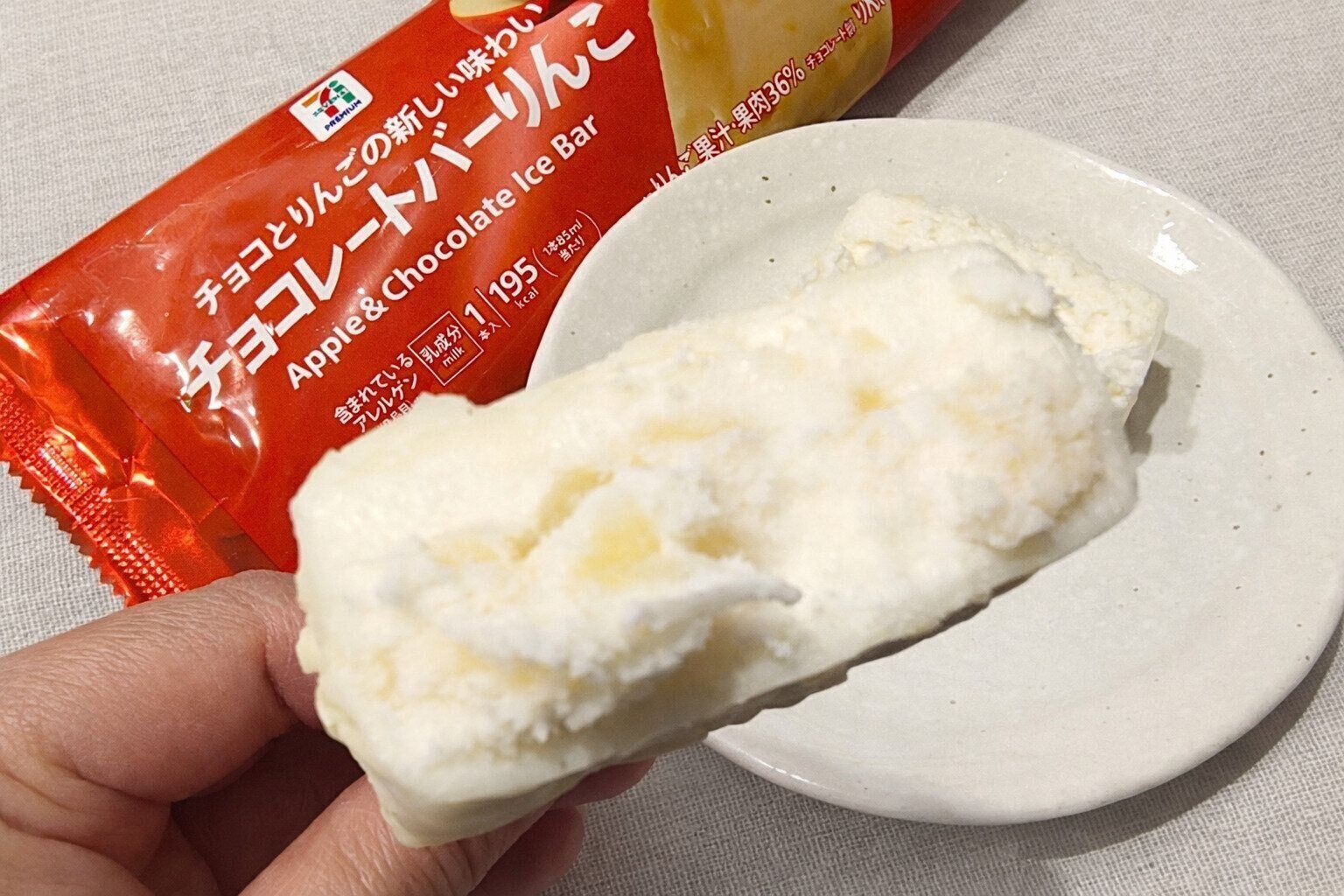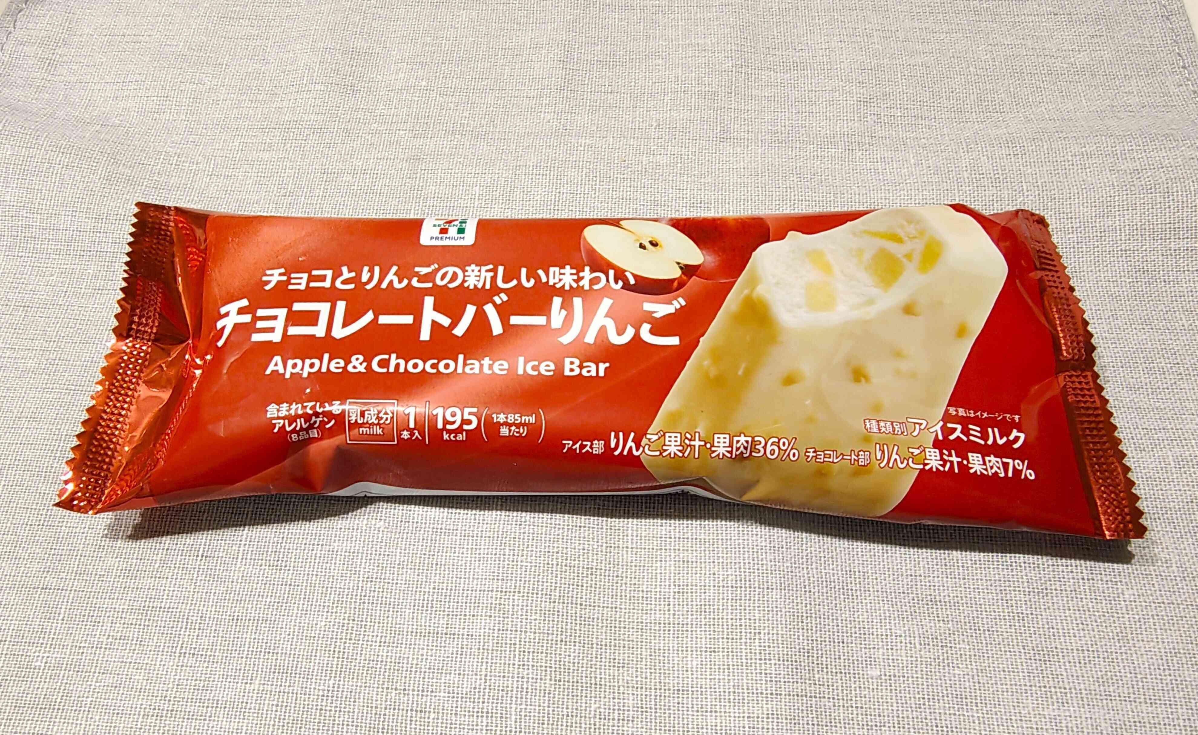 2026年1月7日よりセブンイレブンにて登場した「チョコレートバー りんご」。りんごの果肉がたくさん入ったアイスを、りんごクランチが入ったりんごチョコレートでコーティングしたアイスバーです。
