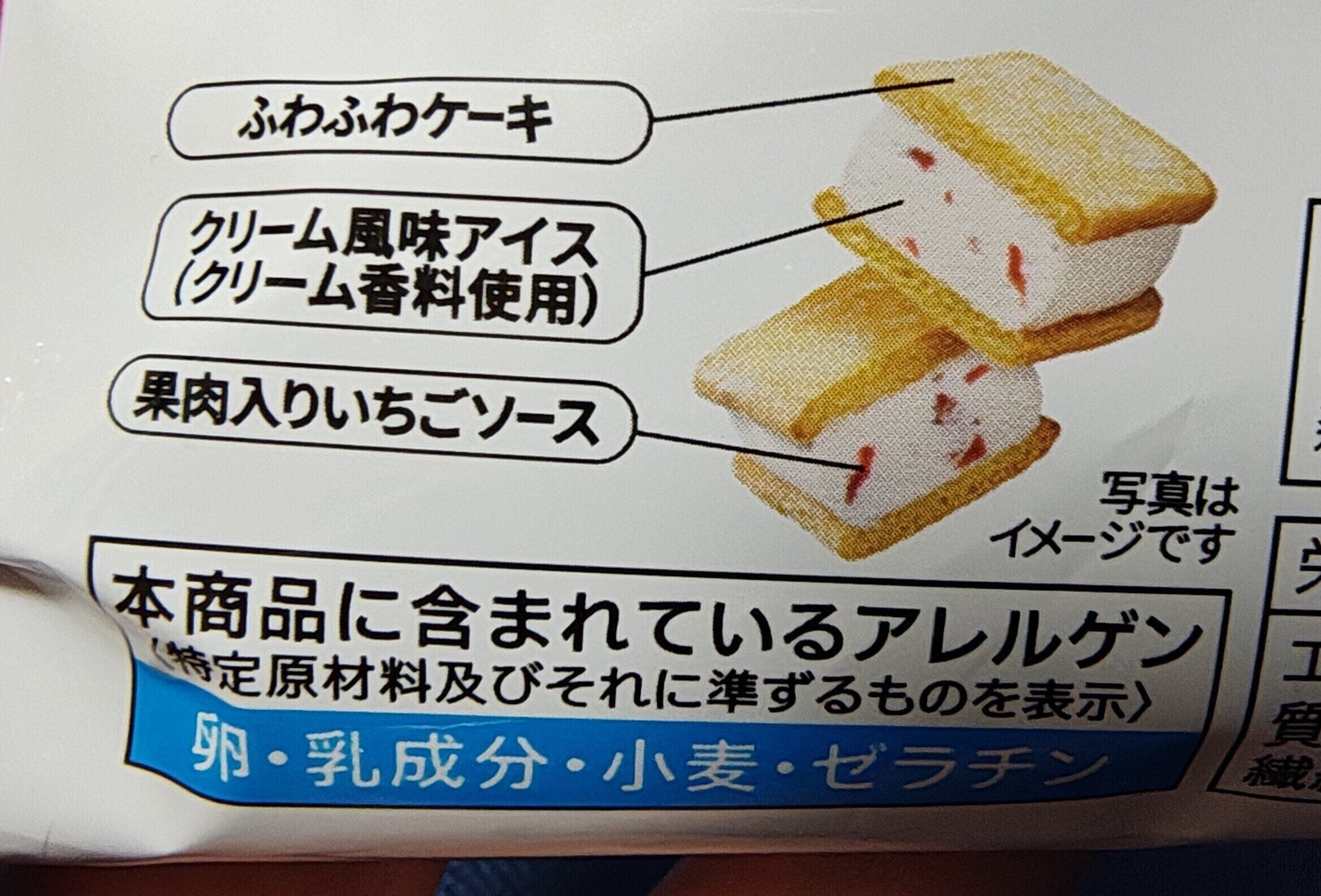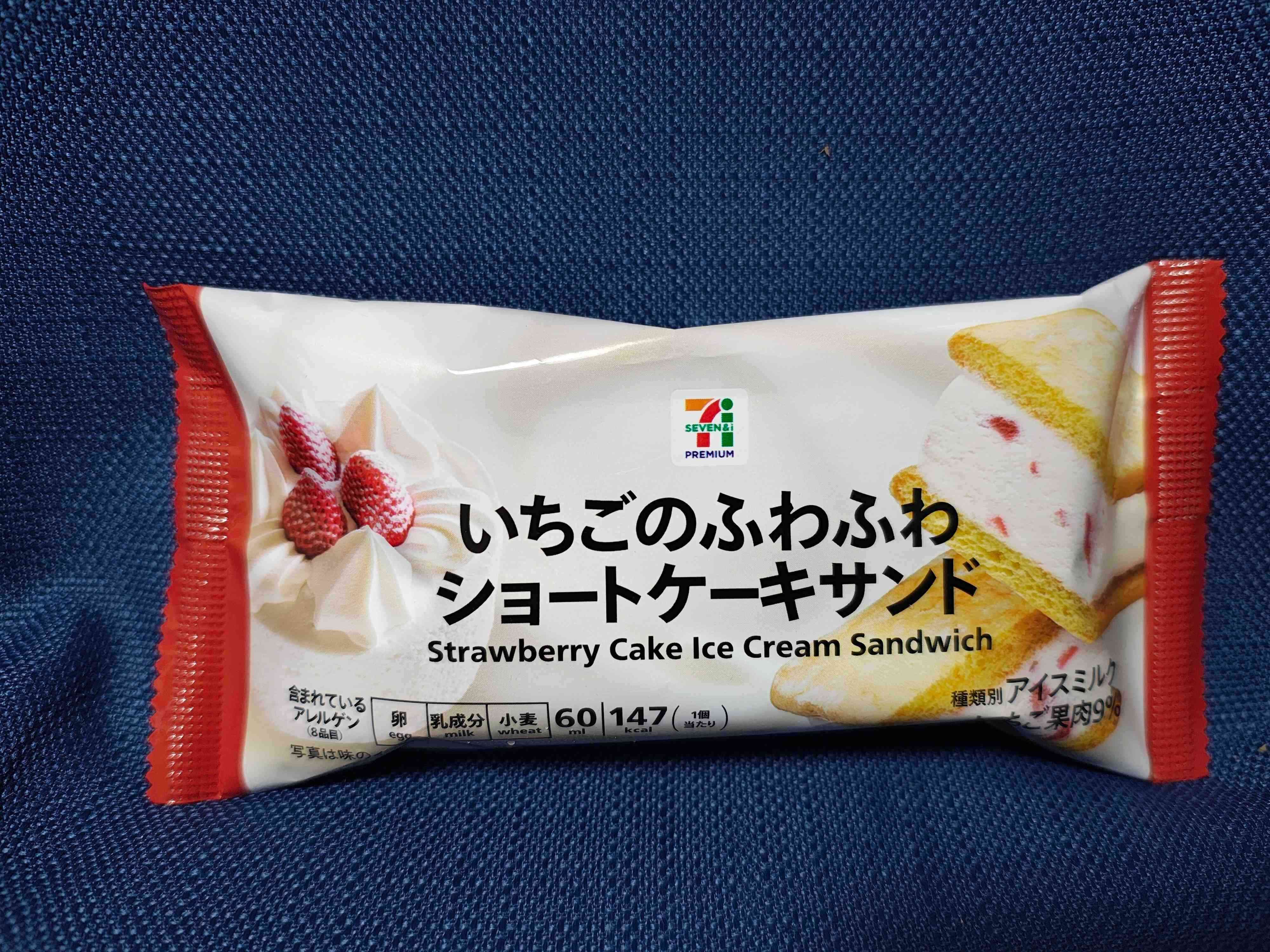 果肉入りいちごソースが入ったクリーム風味アイスをケーキ生地でサンドした「いちごのふわふわショートケーキサンド」。セブンイレブンで2026年1月6日から発売されました。
