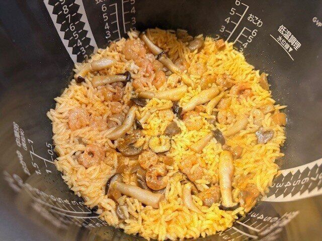 - 炊飯器で炊いただけとは思えない旨味の魚介のパエリアが完成!
