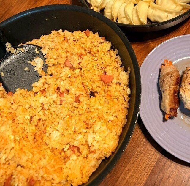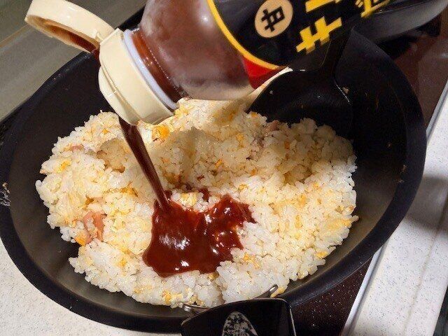 まずはチャーハンにしてみました。いつものようにチャーハンを作り、最後の味付けで「キムチだれ」を入れるだけ。