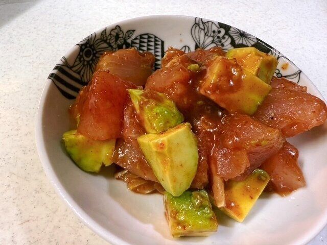 和え物としても使いました。マグロとアボカドをカットして「キムチだれ」を和えただけ。