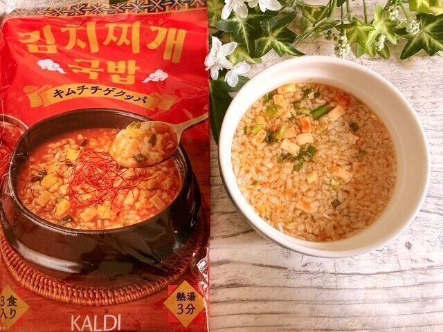 なんとスープなのですが、乾燥ごはんが入っています。粉末スープの素が3食分入っていてお湯を注いでかき混ぜるだけでお手軽に、豆腐やねぎ、ニラ、卵が入った具沢山のキムチチゲクッパ。