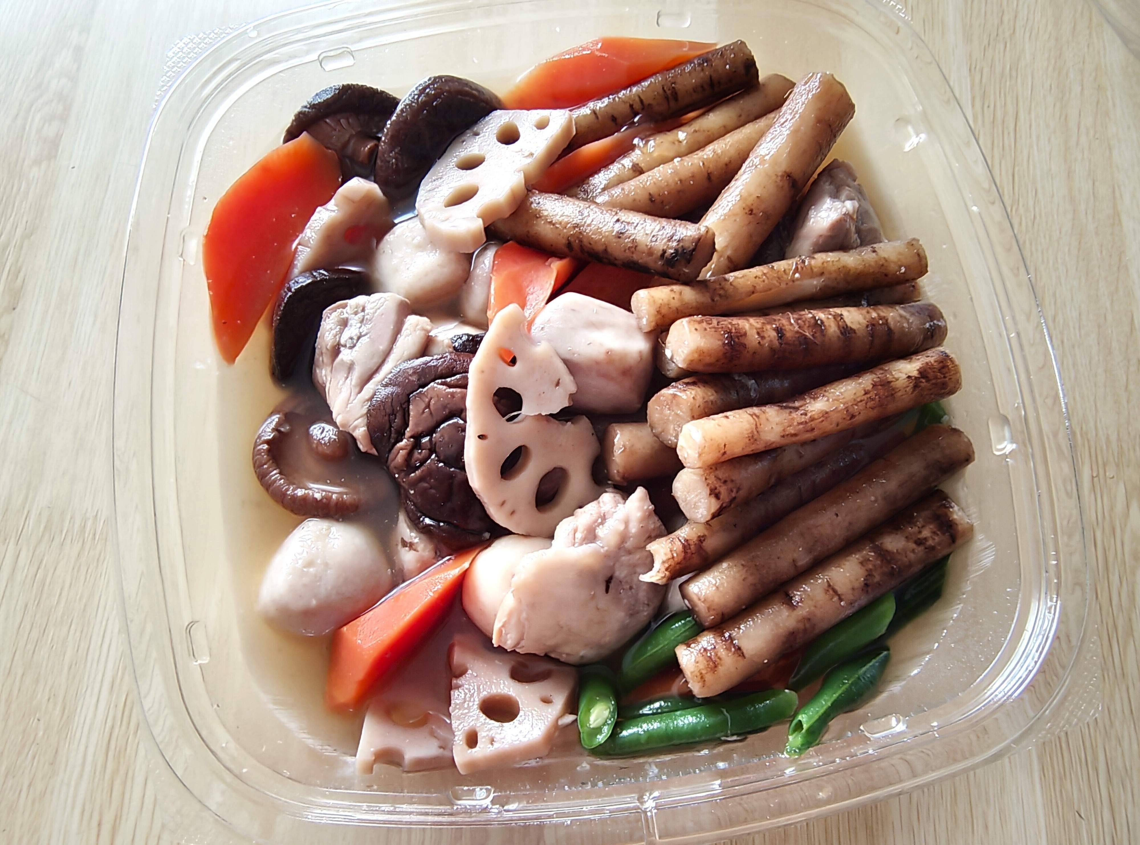 うま味たっぷりなおだしにさまざまな具材が浸っています。ごぼうがとても太いですが、固すぎずとてもおいしいです。さといももねっとり食感。それぞれの具材の味付けや煮加減がちょうどよく、かなり本格的な筑前煮です。