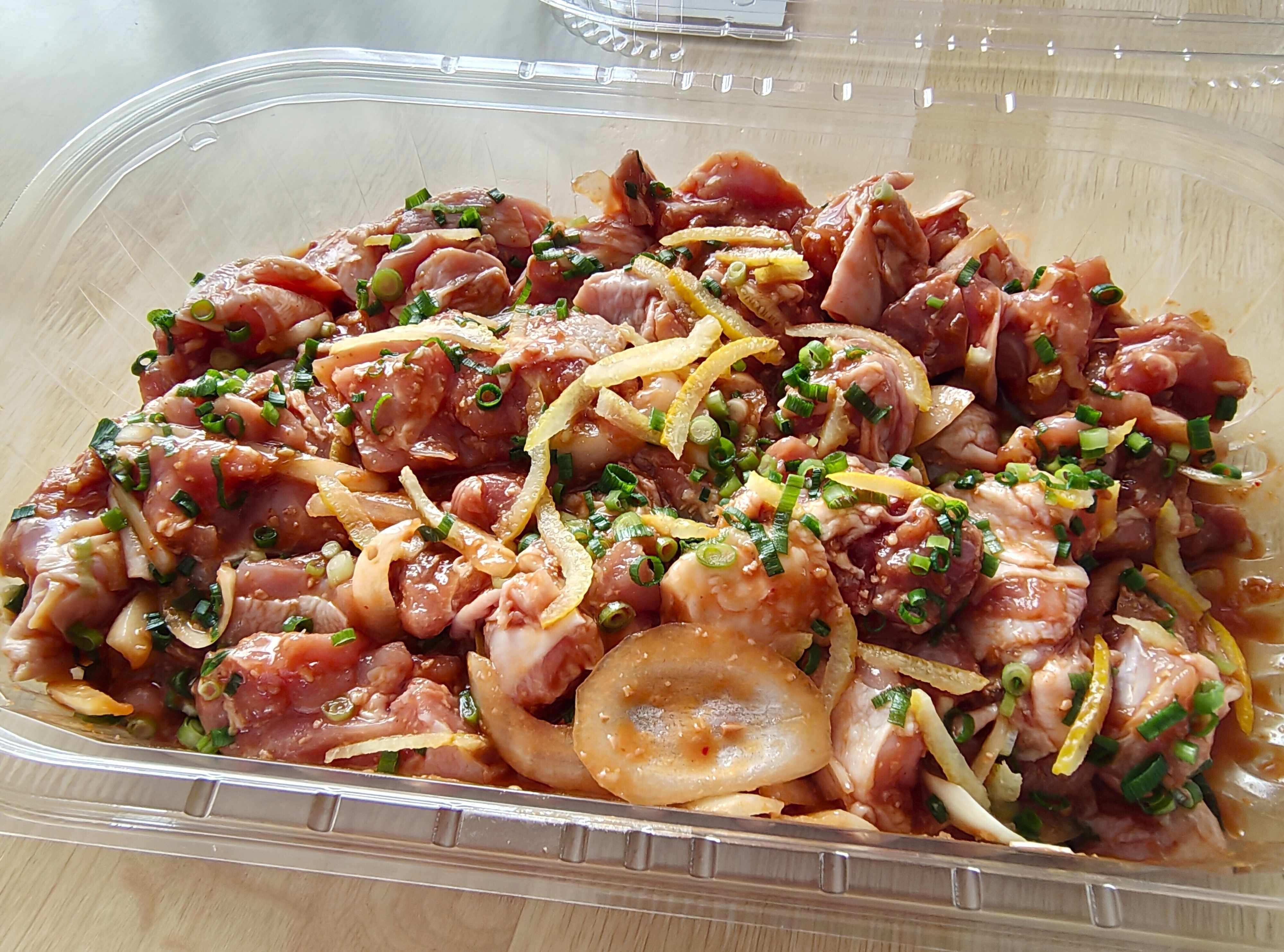 続いてコストコのデリコーナーに登場した「鶏肉の山椒味噌漬け」。こちらもグラム単位の販売となります。100gあたり158円で、1,800円~1,900円ほどのものが多かったように感じました。こちらは非加熱商品なので、しっかり焼く必要があります。