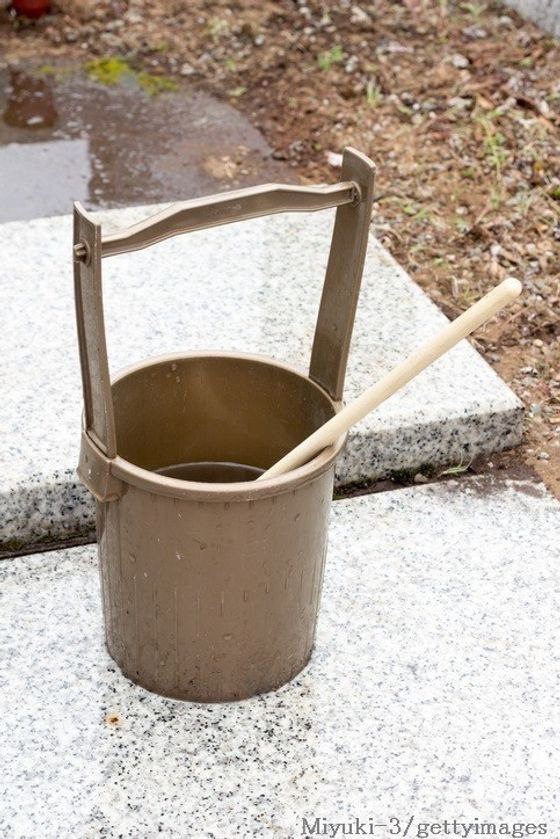 水を入れる手桶、その水をすくうひしゃくはお墓の管理事務所などで借りることができます。もし、借りられない場合は、手桶とひしゃくも持参します。
